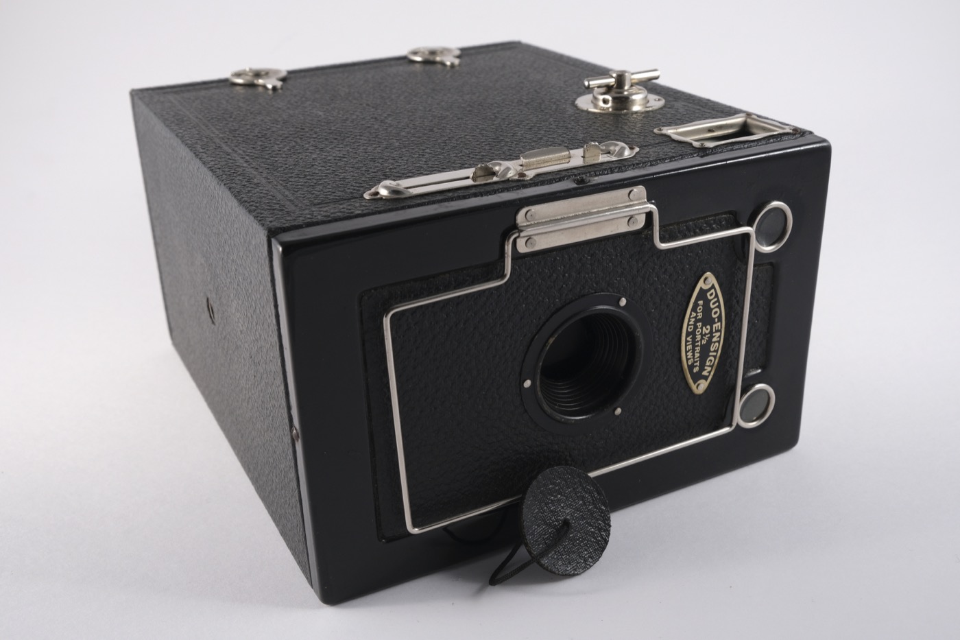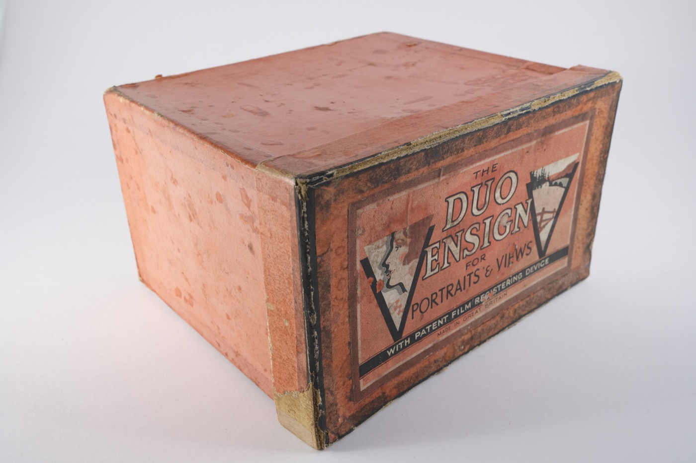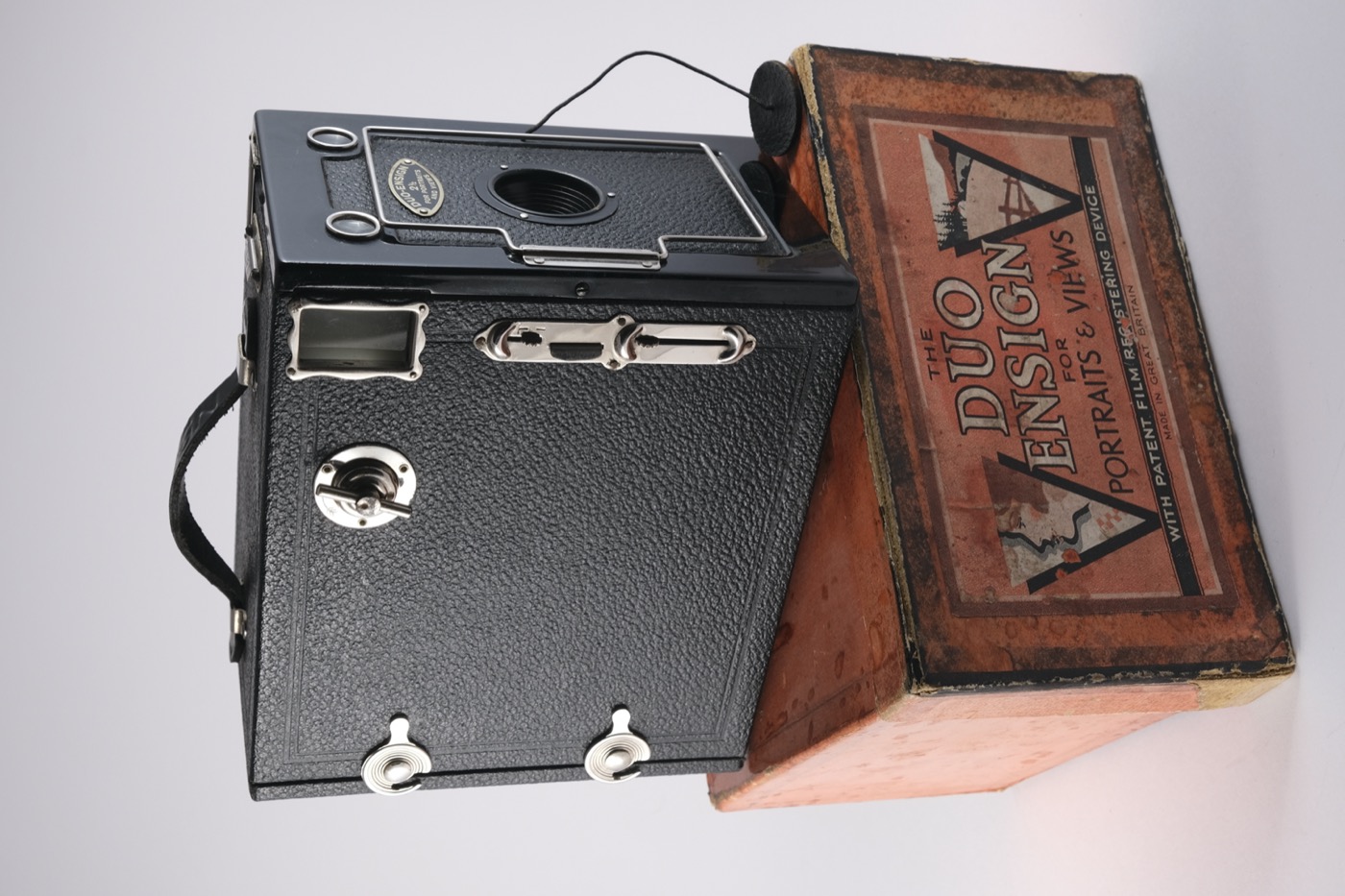 Duo-Ensign box camera dating from 1930. It takes 2 1/2 inch x 4 1/4 inch exposures on 120 roll film.