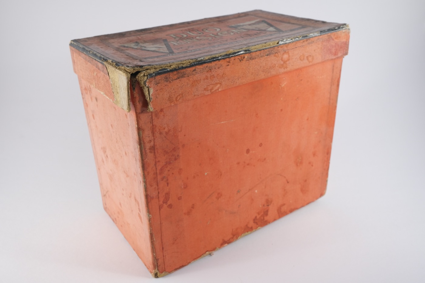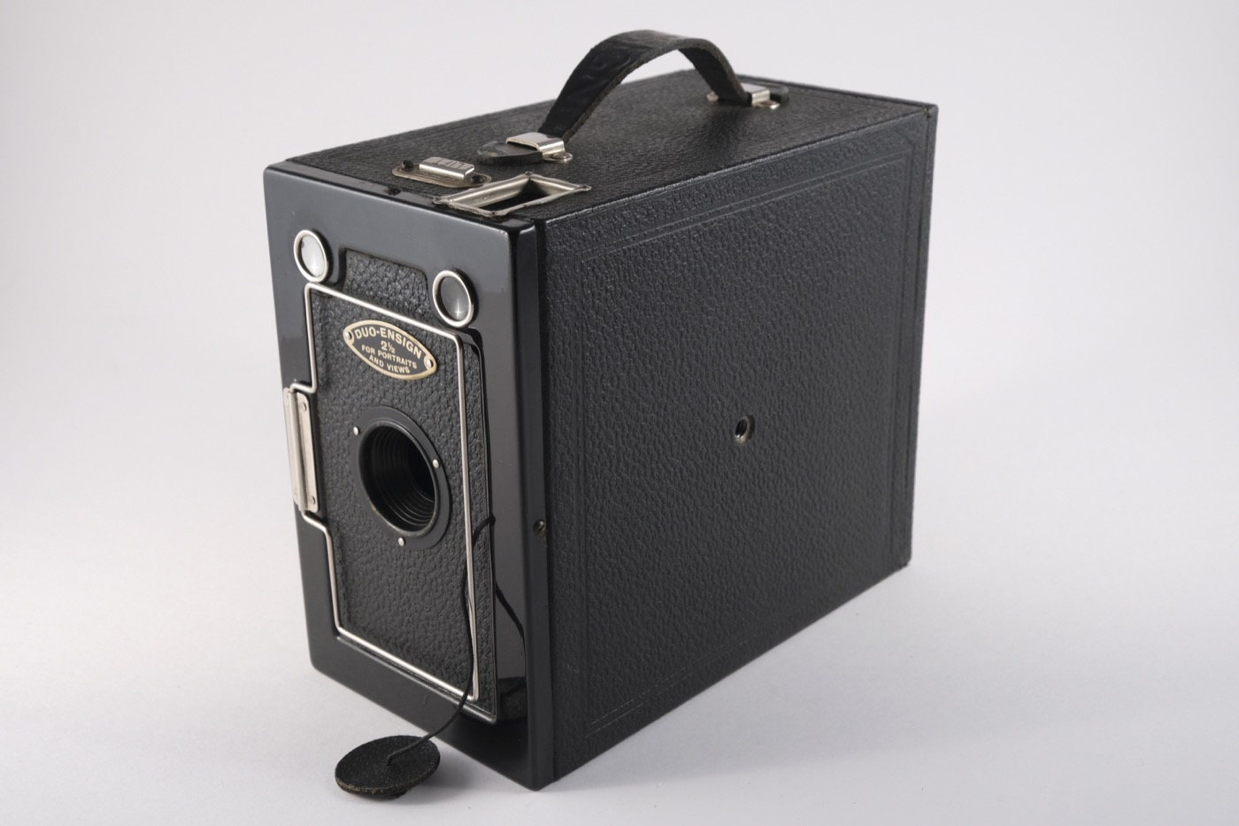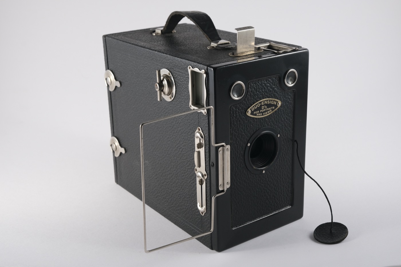 Duo-Ensign box camera dating from 1930. It takes 2 1/2 inch x 4 1/4 inch exposures on 120 roll film.