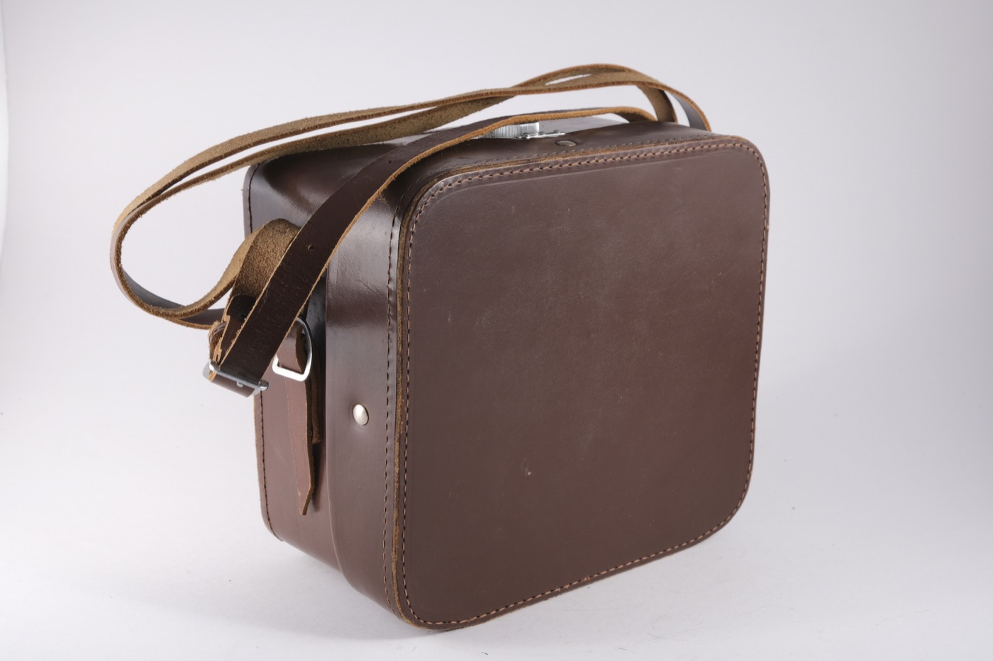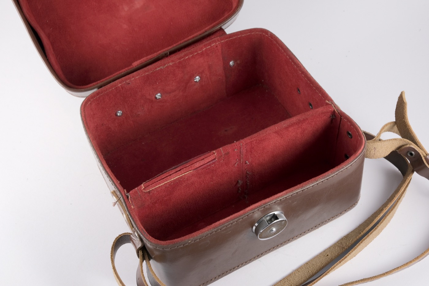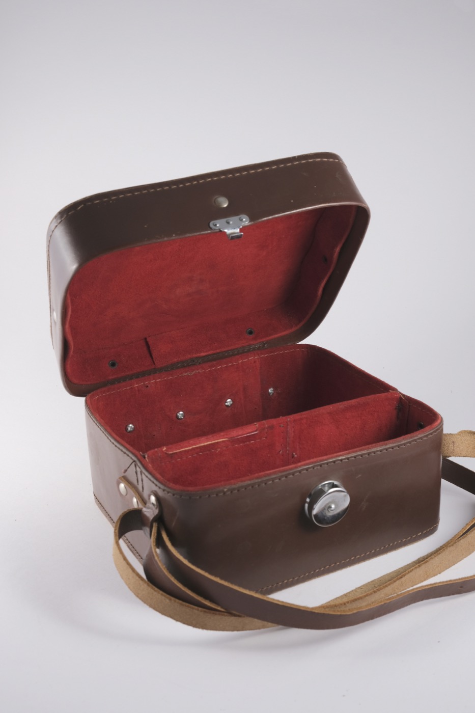 A hard leather camera case, intended to carry a small 35mm film camera. It has a nice rotating metal catch.