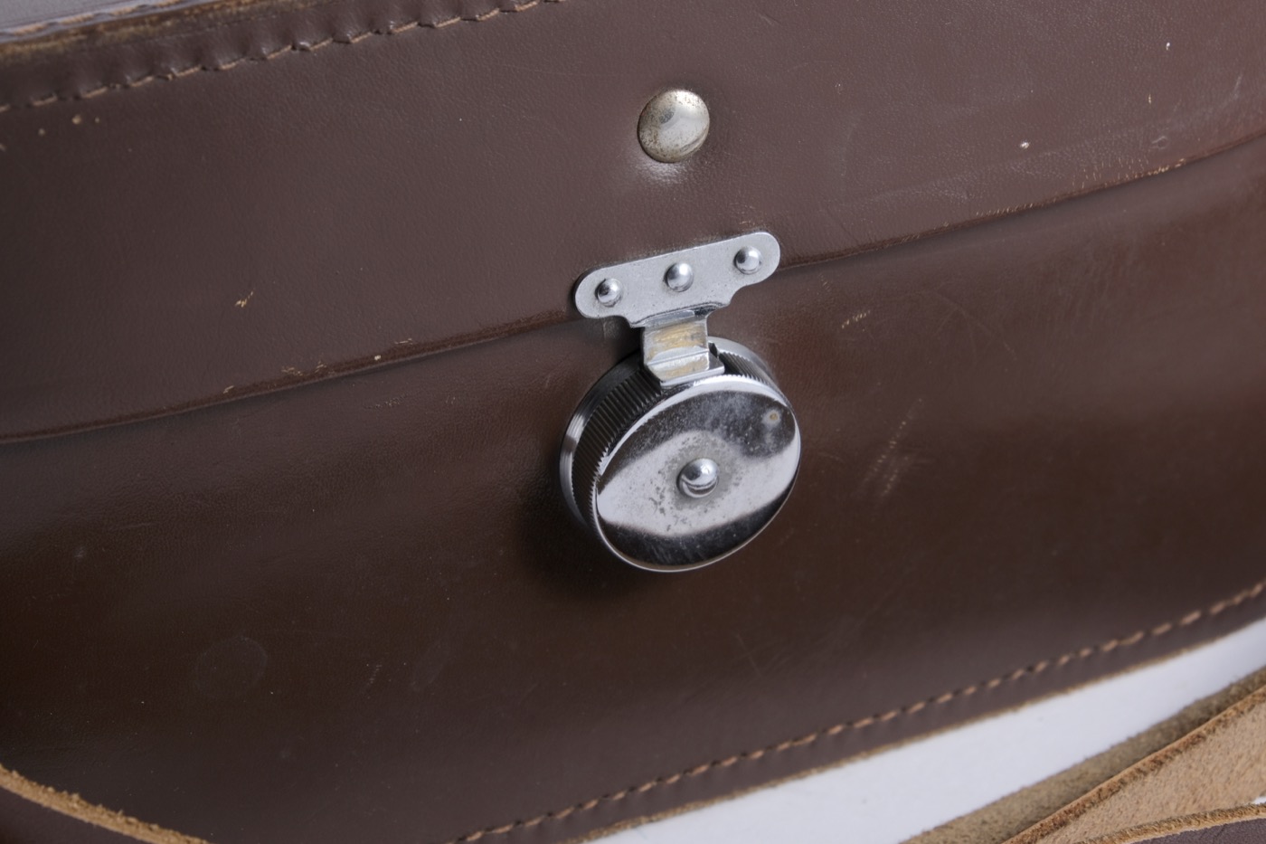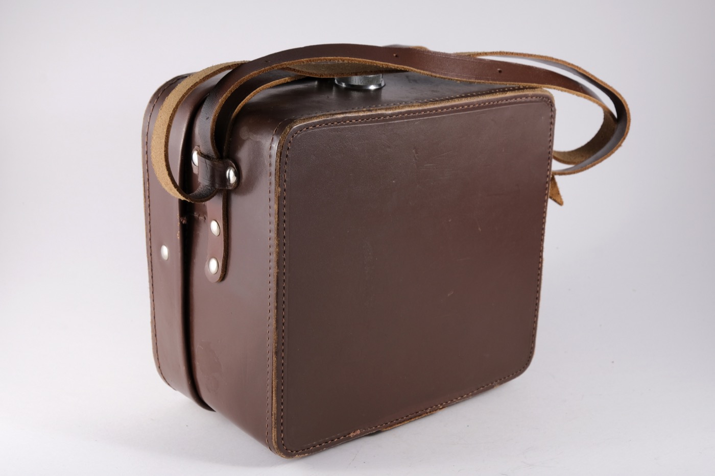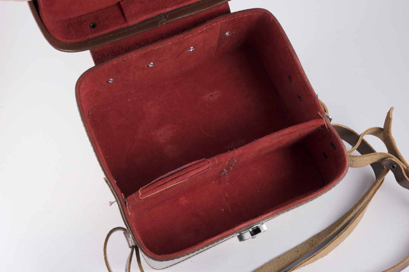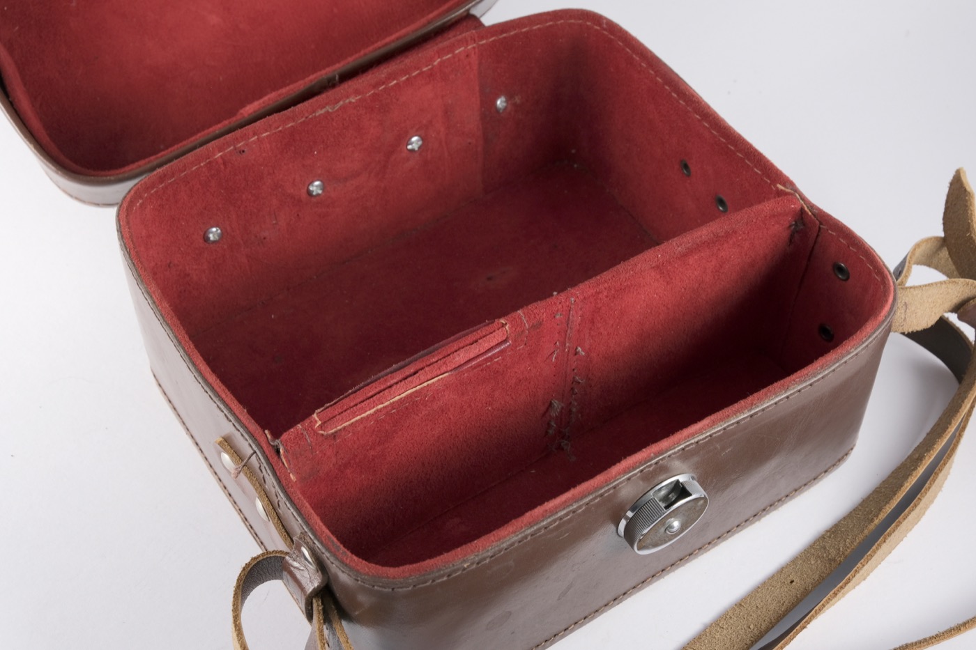 A hard leather camera case, intended to carry a small 35mm film camera. It has a nice rotating metal catch.