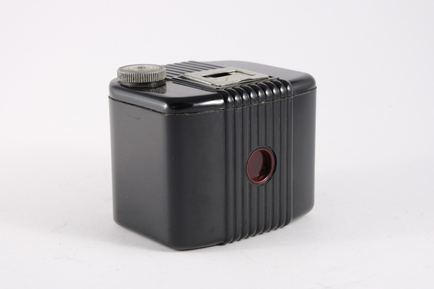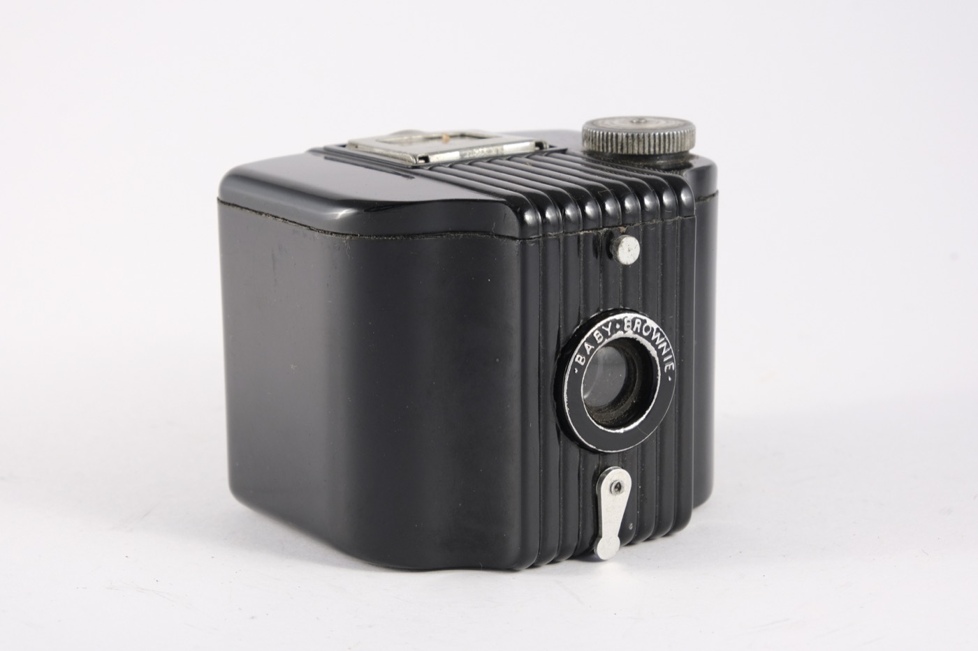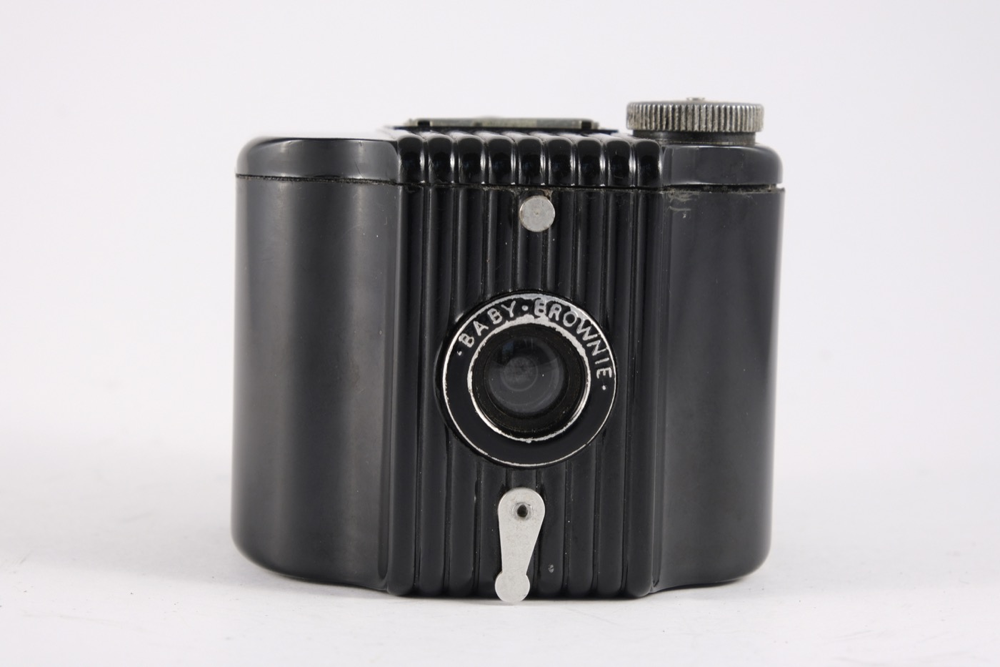 The Baby Brownie is a small, basic camera (art deco style), made of Bakelite with a flip-up frame viewfinder. The shutter is operated by the lever under the lens. The camera was manufactured from 1948 to 1952 in the UK. It takes 6 x 4 cm images on 127 film, using a simple meniscus lens and rotary shutter.