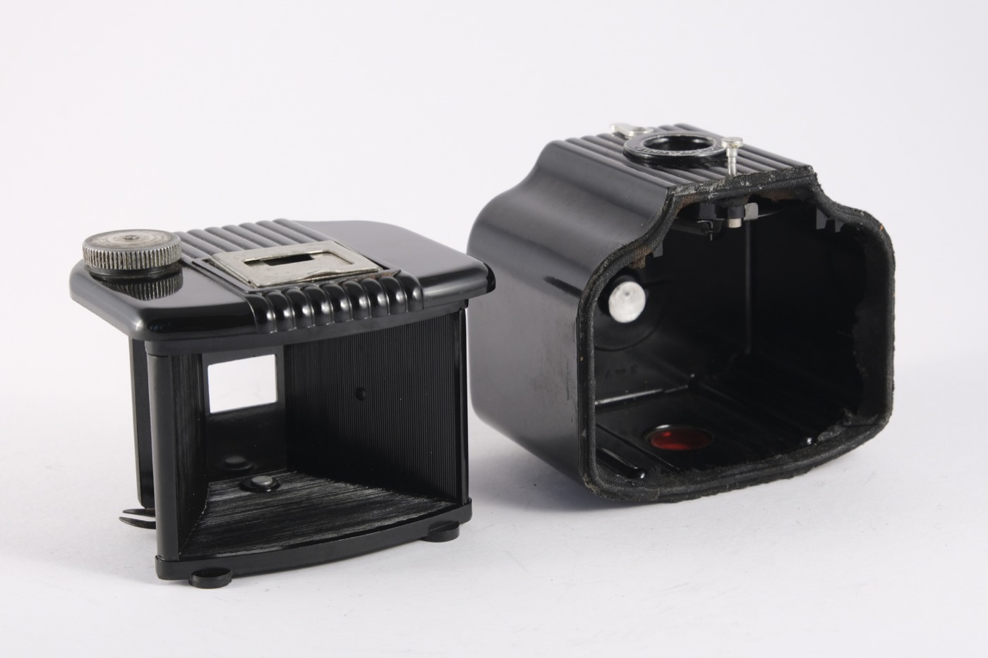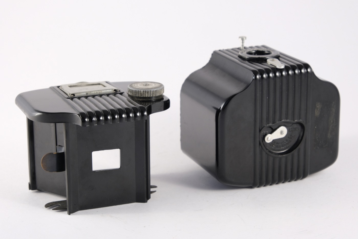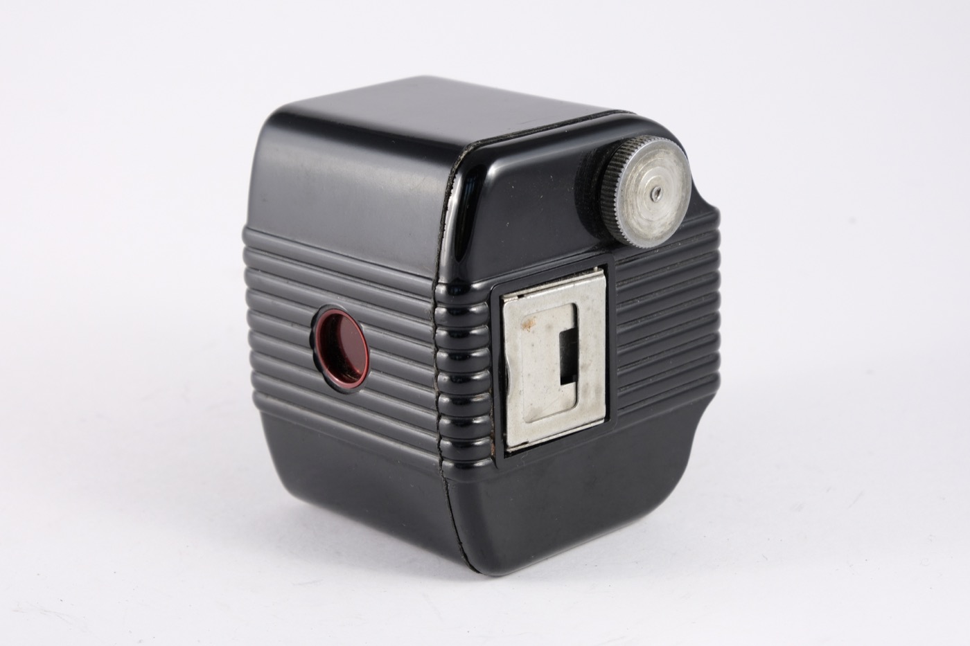 The Baby Brownie is a small, basic camera (art deco style), made of Bakelite with a flip-up frame viewfinder. The shutter is operated by the lever under the lens. The camera was manufactured from 1948 to 1952 in the UK. It takes 6 x 4 cm images on 127 film, using a simple meniscus lens and rotary shutter.