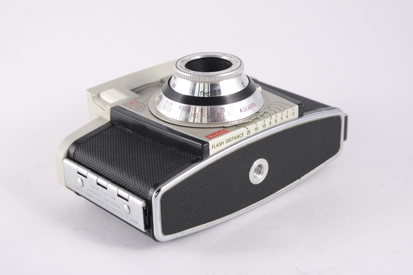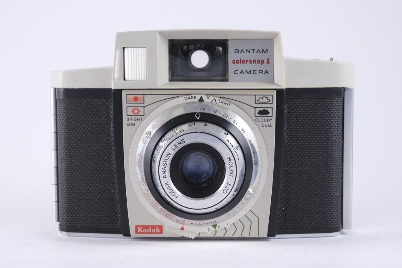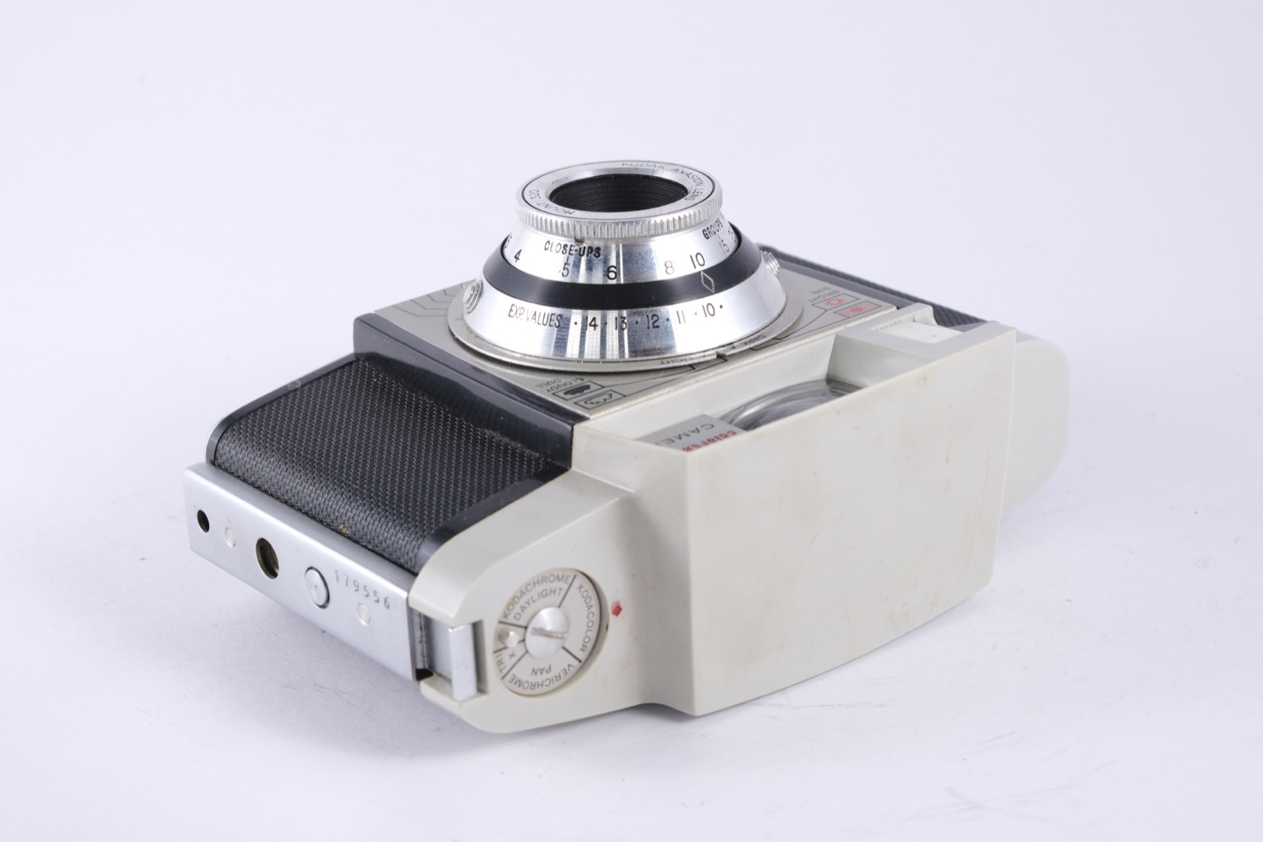 This is the 1961 model (1961-63) of the camera. The exposure is selected using a true Exposure Value scale. The exposure scale around the lens is linked with pointers (for dark and light scenes) to four weather symbols on the front plate. There is a second scale on the EV ring, below the lens, for use with flash. The lens is an f/3.9. The film is advanced by a lever on the right. The camera requires type 828 film.