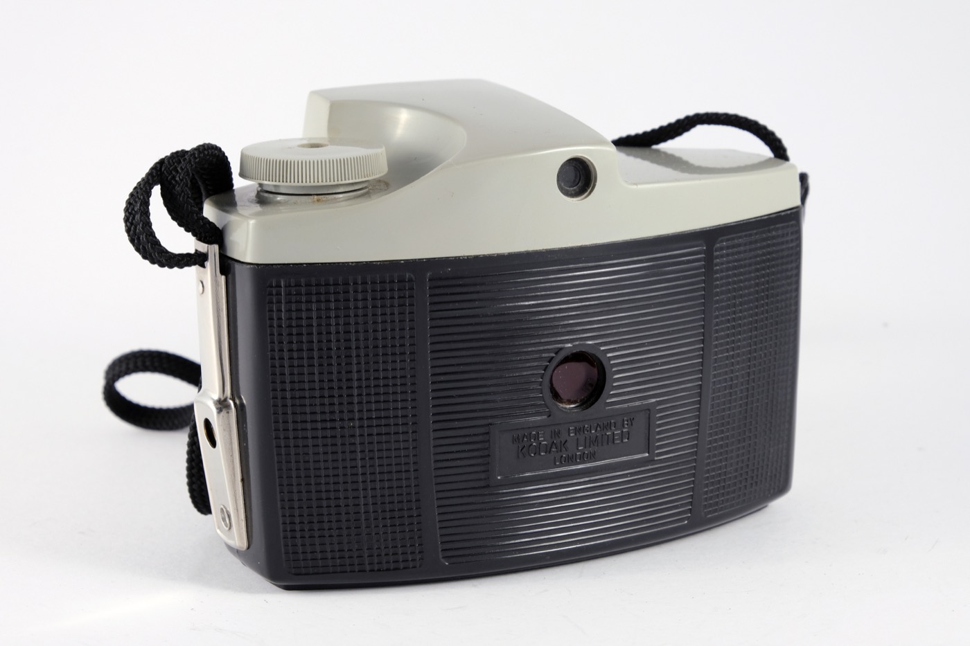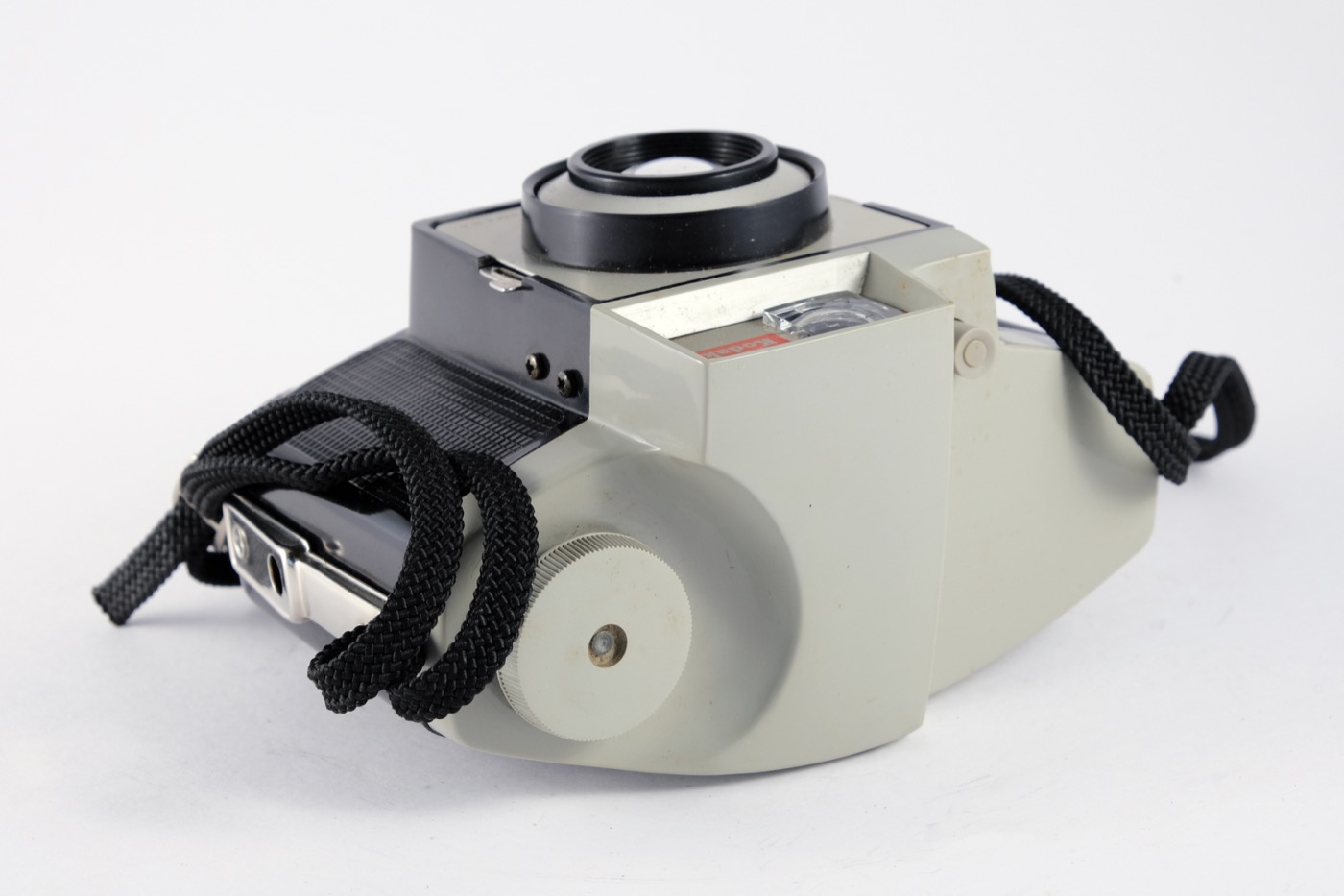 This camera has a moulded plastic body with grey top and plain lens panel, screw and pin flash contacts, optical direct vision finder, and two apertures.