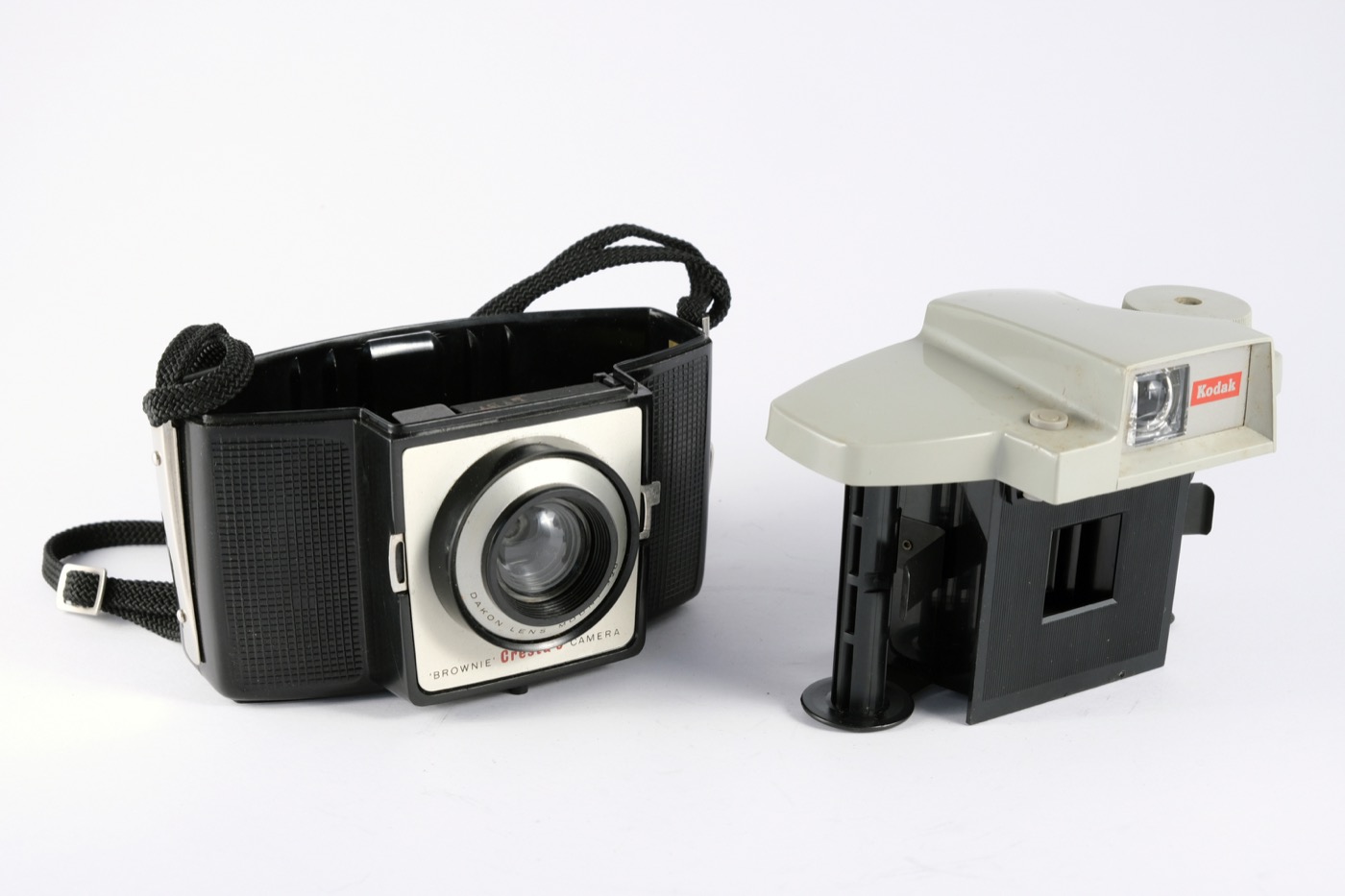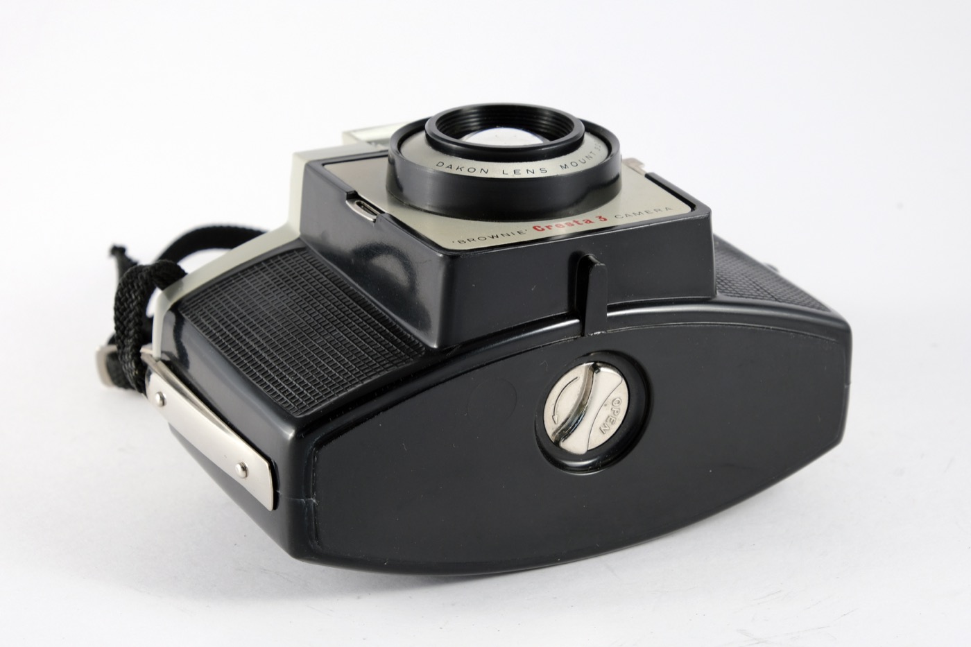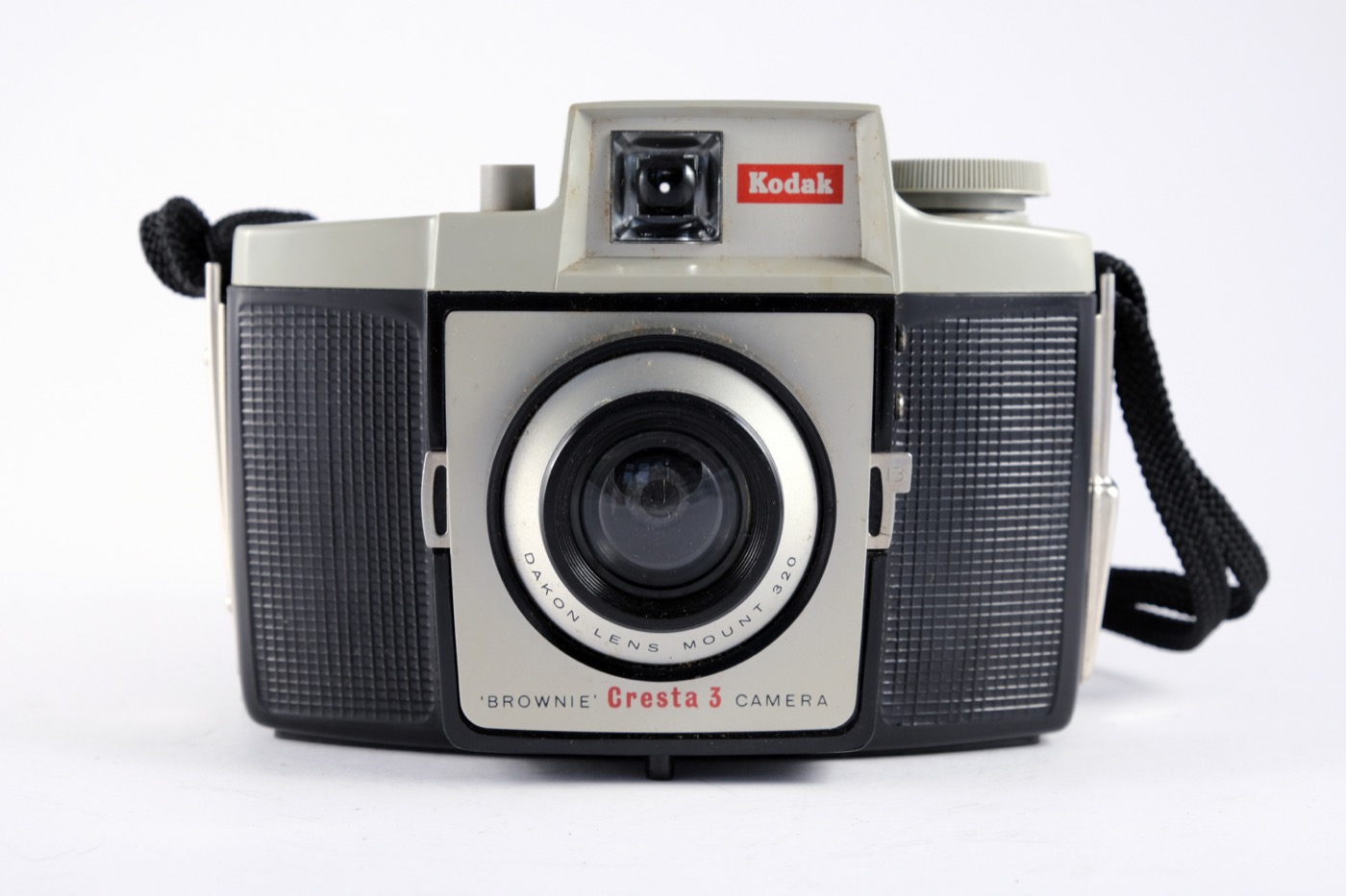 This was the last Brownie Cresta model manufactured. It was redesigned with a more angular style moulded plastic body and an acrylic Dakon lens. It uses 120 film for a large 6cm X 6cm negative image.