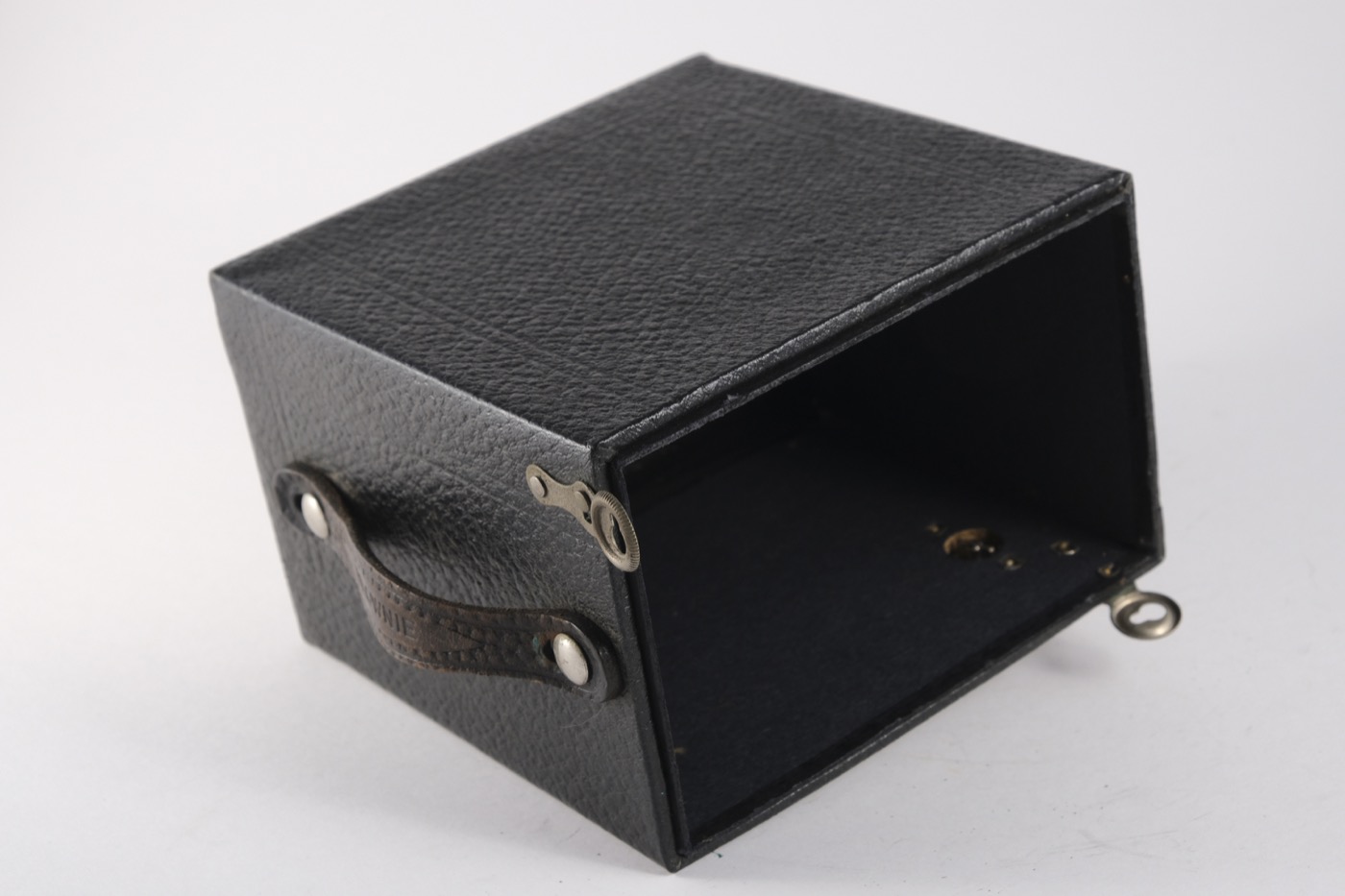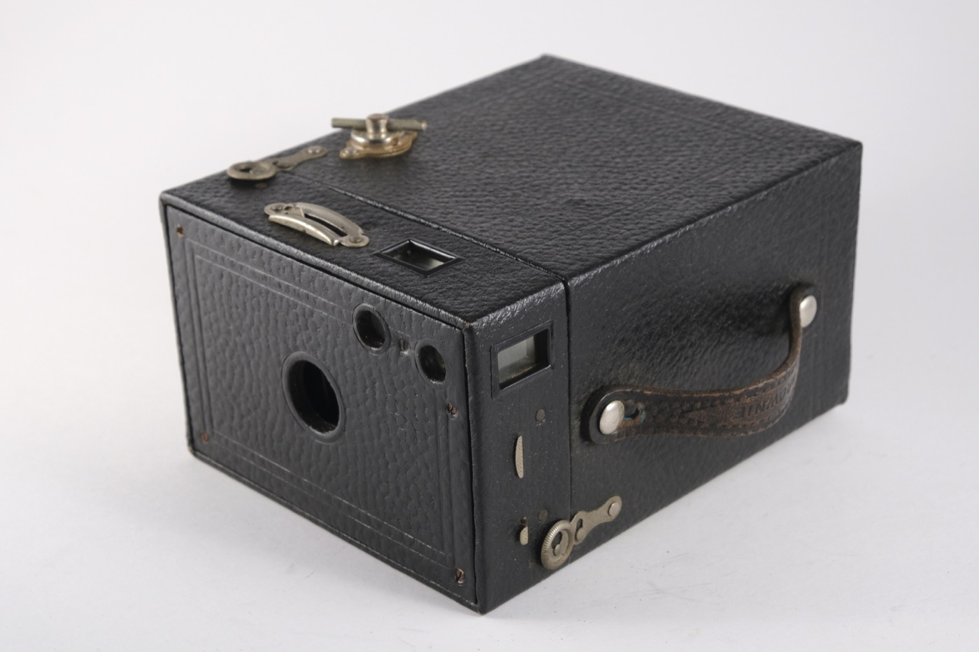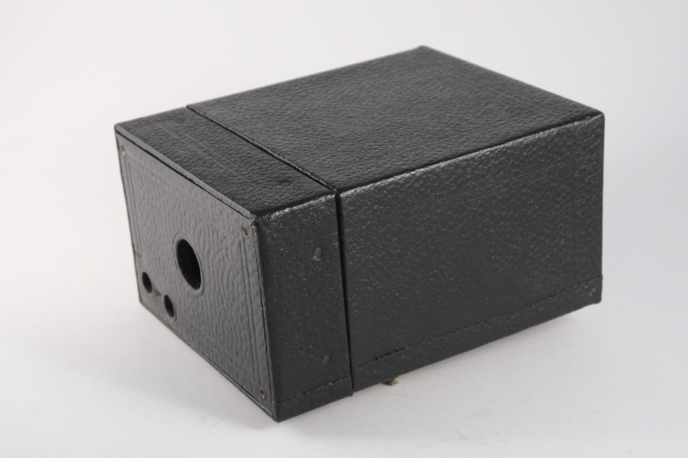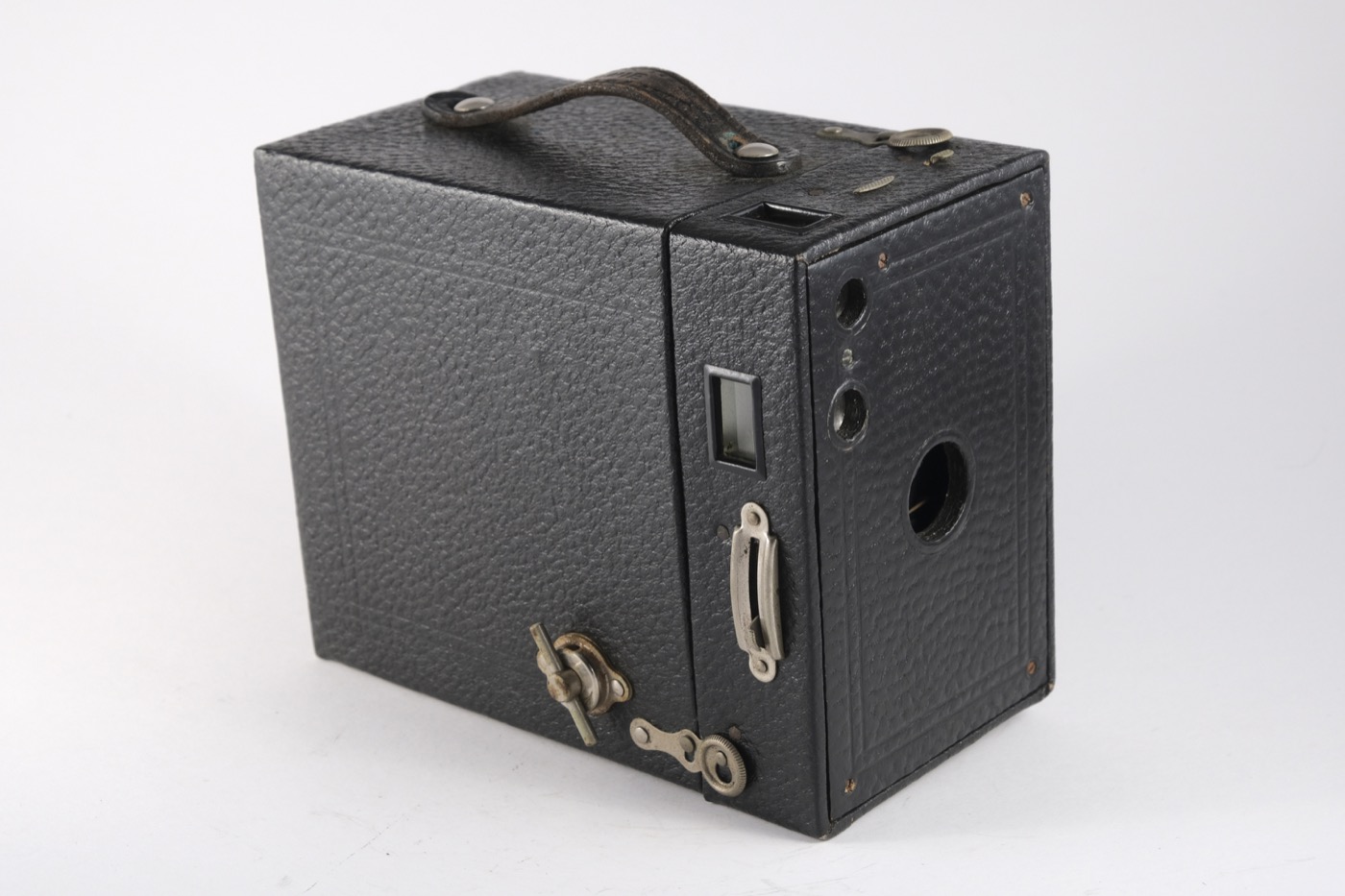 The No.2 Brownie is a simple box camera with a very dependable shutter. It has two sliding mechanisms on the top, one for a bulb, or time setting, and the other for a choice of 3 apertures. It also has two small reflecting finders for vertical or horizontal shots. It uses 116 film; with some ingenuity it can be converted to use commonly available 120 film: