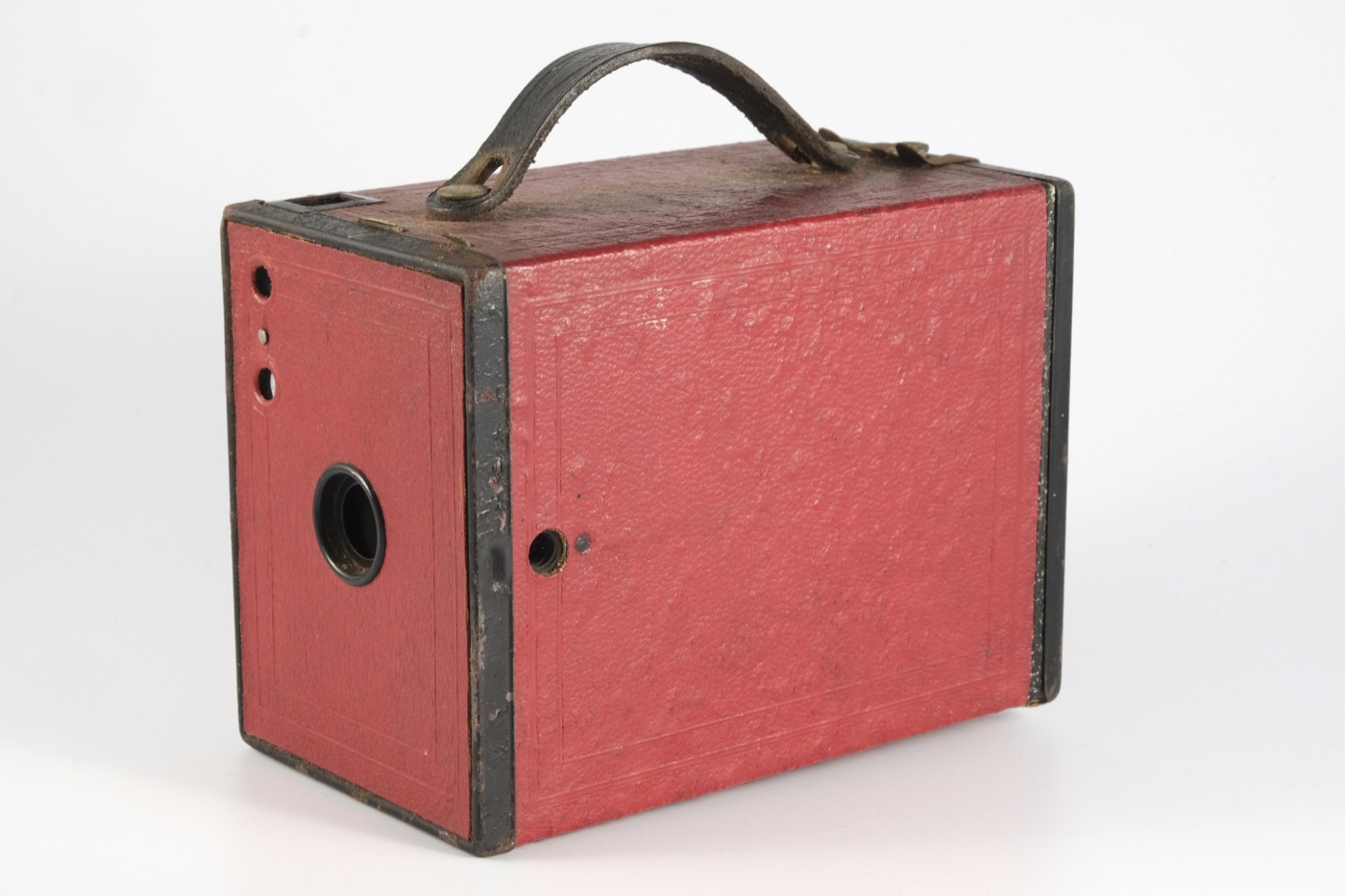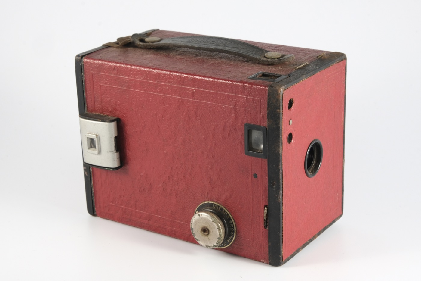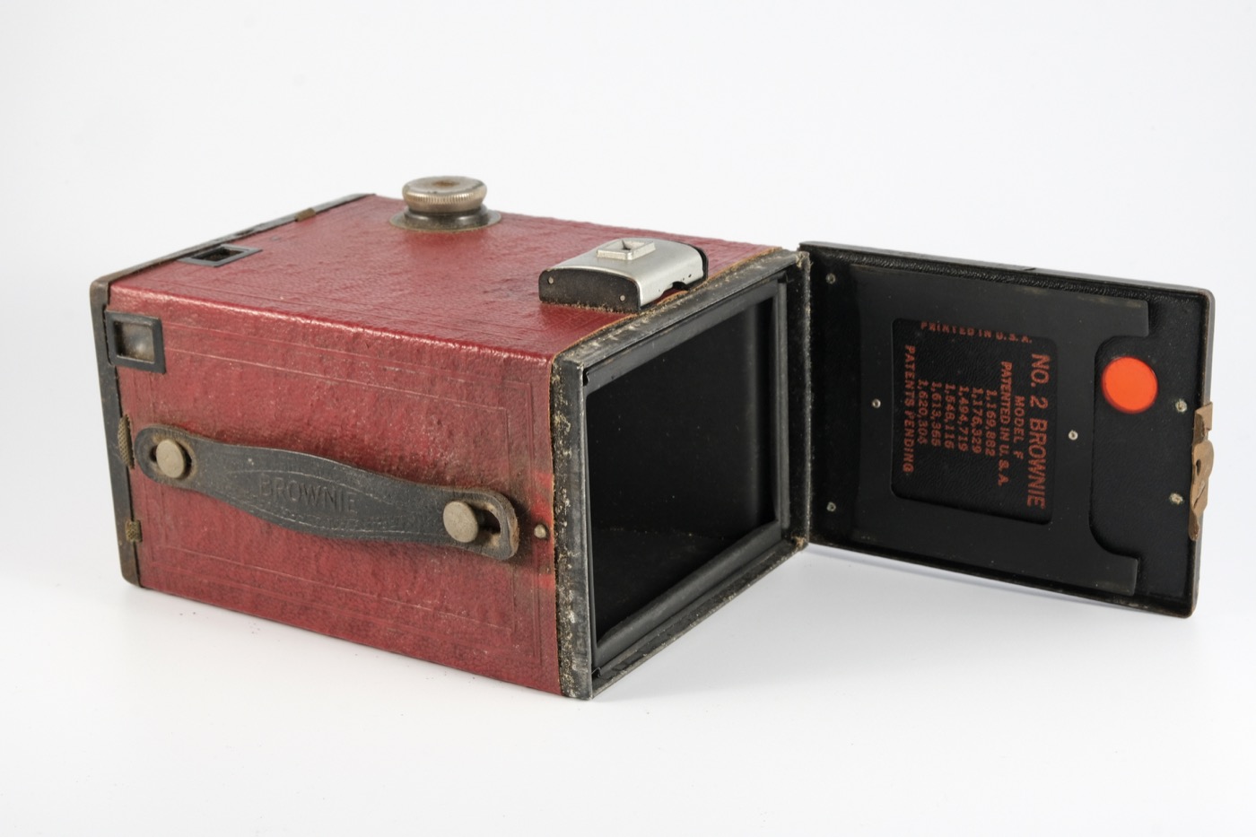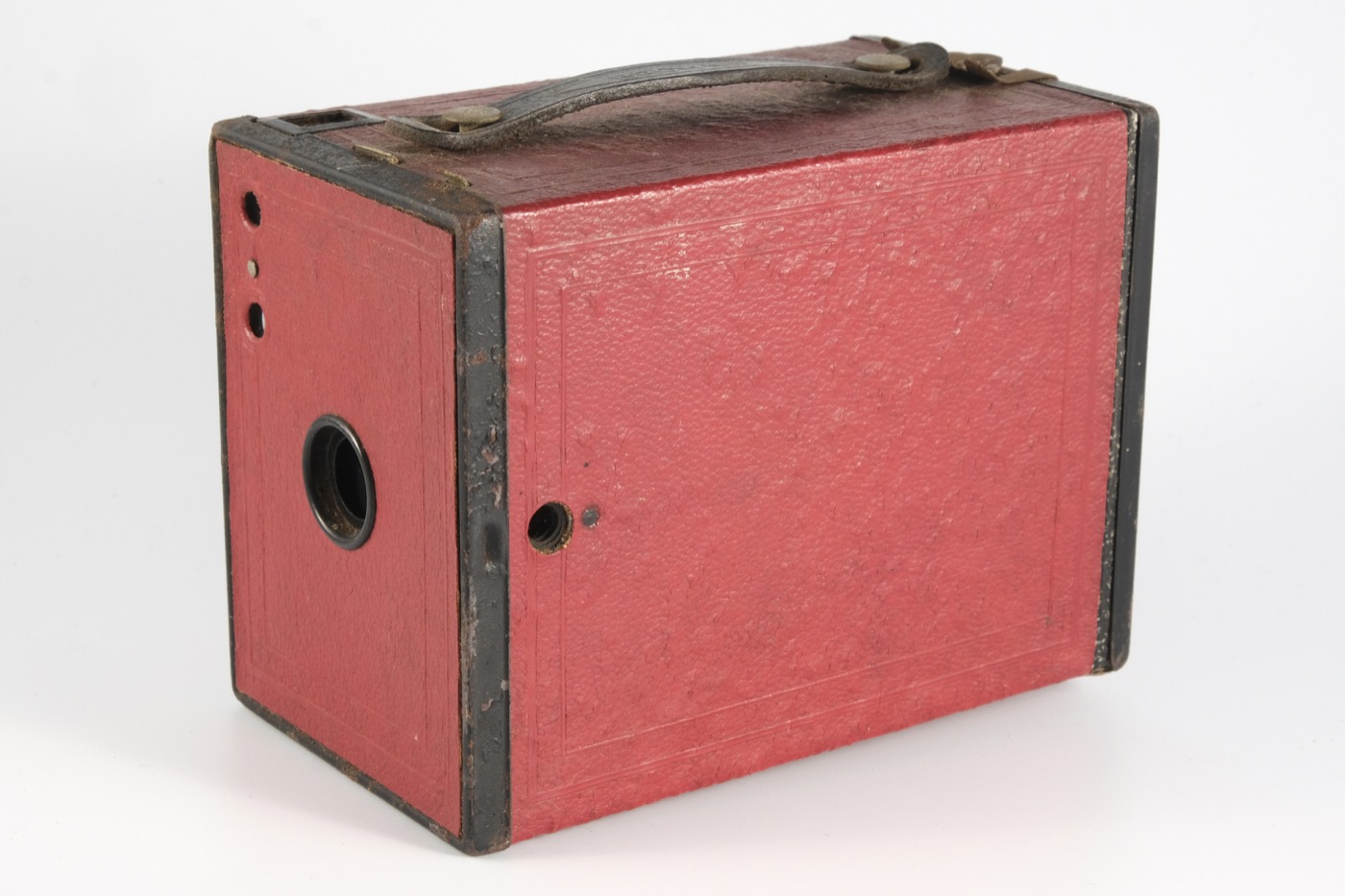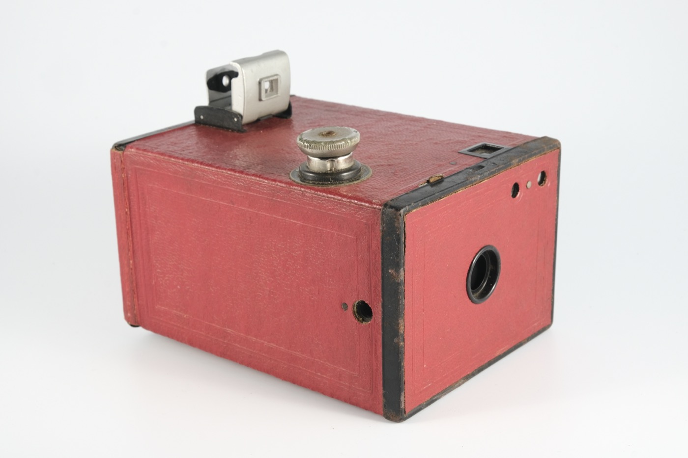 Kodak No 2 Brownie Model F box camera in an unusual red colour.