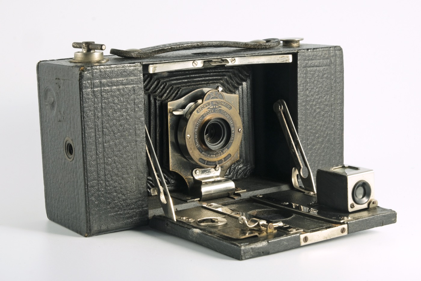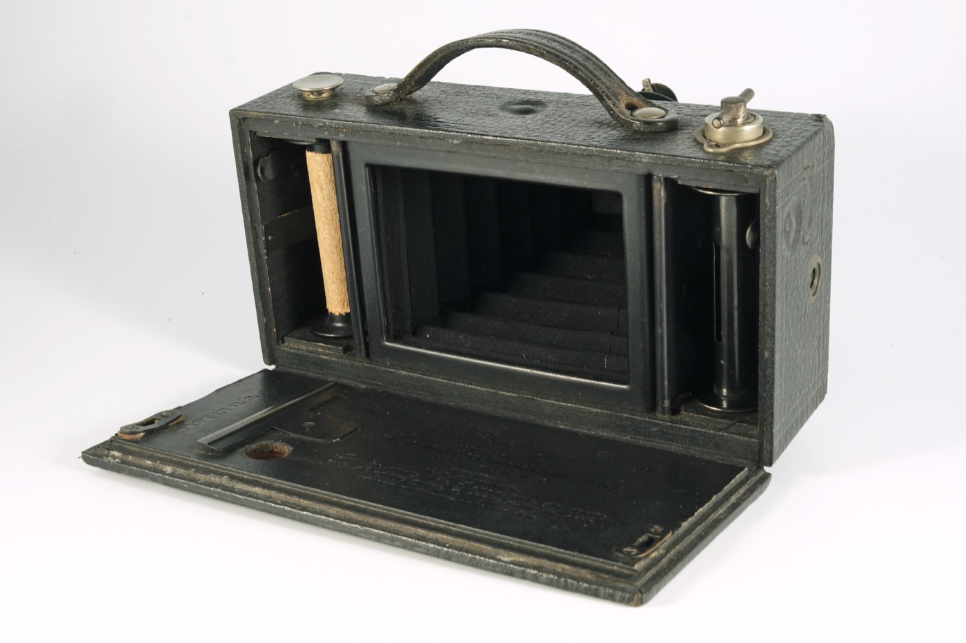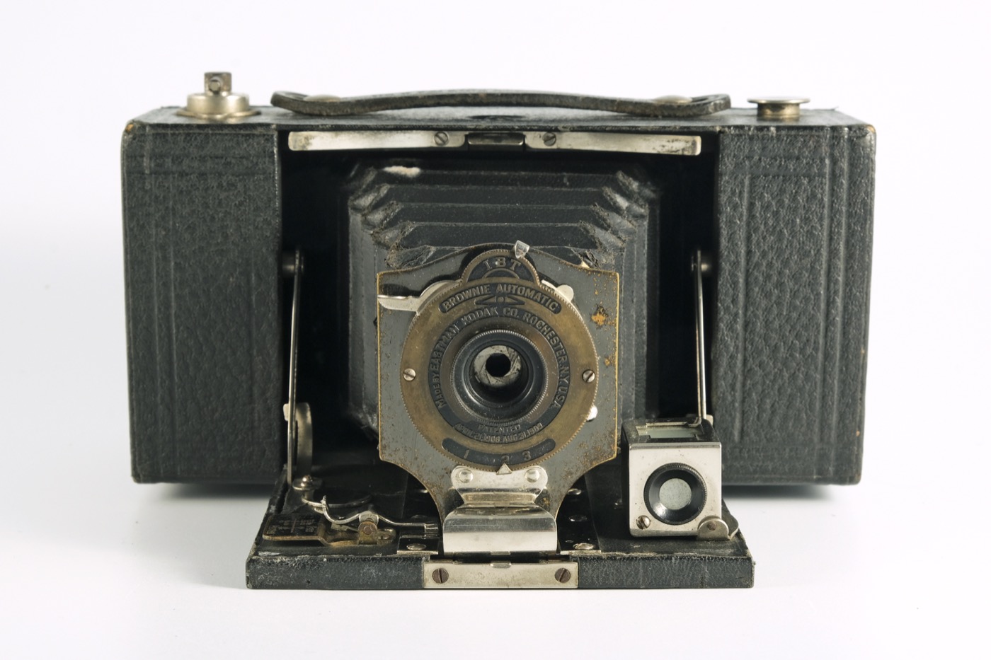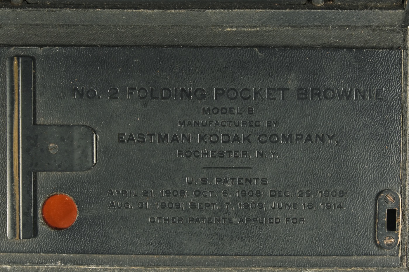 The No 2 Folding Pocket Brownie is a folding camera made by Kodak in Rochester, NY, USA, from c. 1909. It has a rectangular, leatherette covered wooden body, and a sliding lens post connected to the body by black leather bellows. It takes 6 x 9 cm exposures on 120 roll-film.