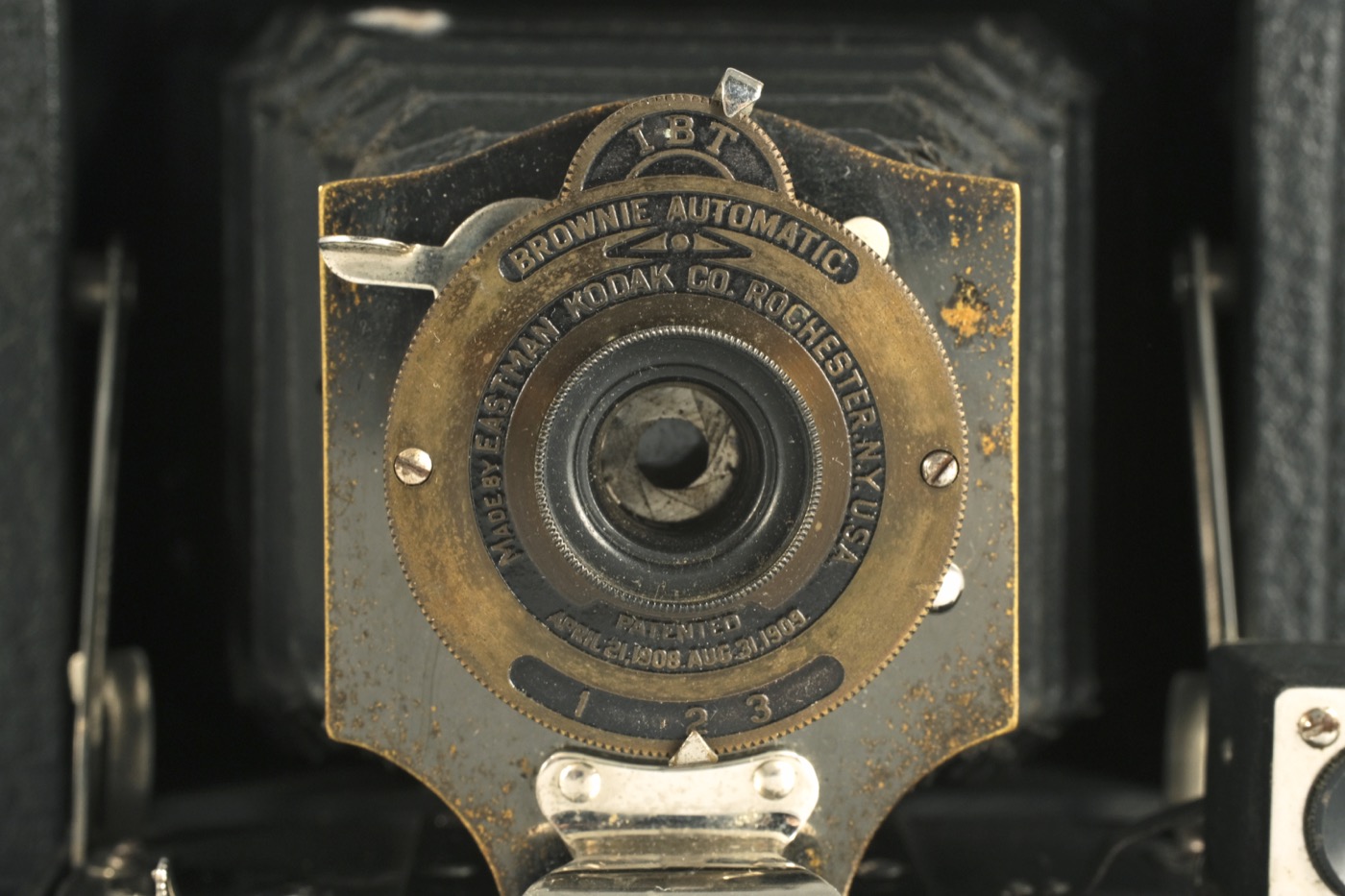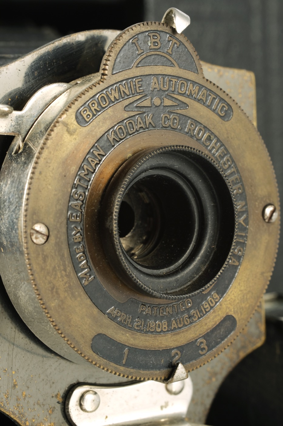 The lens is a 4.5 inch meniscus achromatic with an iris diaphragm having a simple 1, 2, 3 scale. The shutter is a Brownie automatic, providing 3 speeds (T, B and I - the latter is about 1/30 - 1/40 sec). Focusing can be set to three positions (100, 20, 8 feet) by a lever on the baseboard. There is a reflecting viewfinder on the baseboard that flips out for portrait orientation.