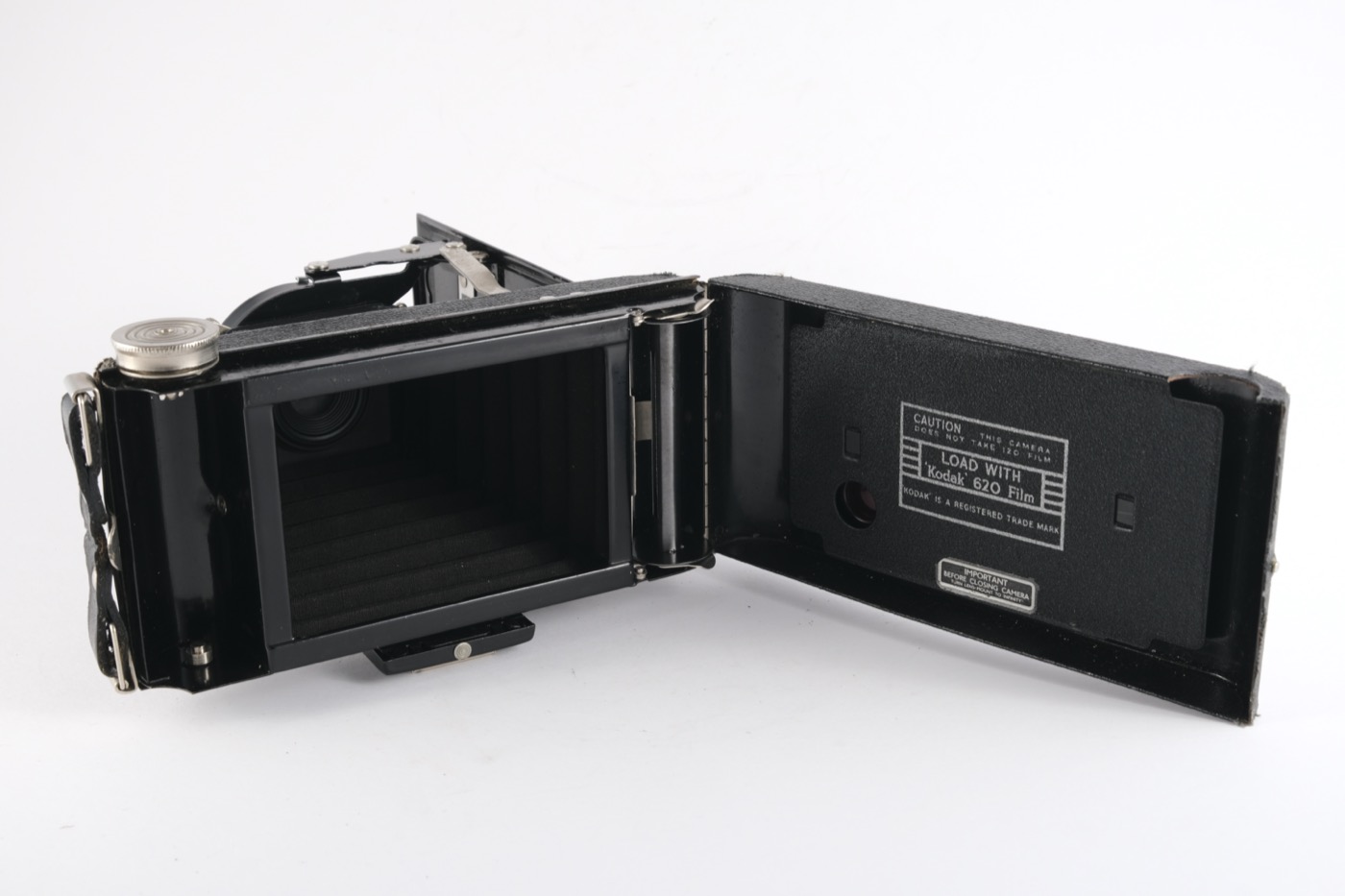 This is the second model of this camera dating from 1948-1954, with a 100mm f/6.3 Anaston lens in a Dakon shutter. The camera takes 620 film.