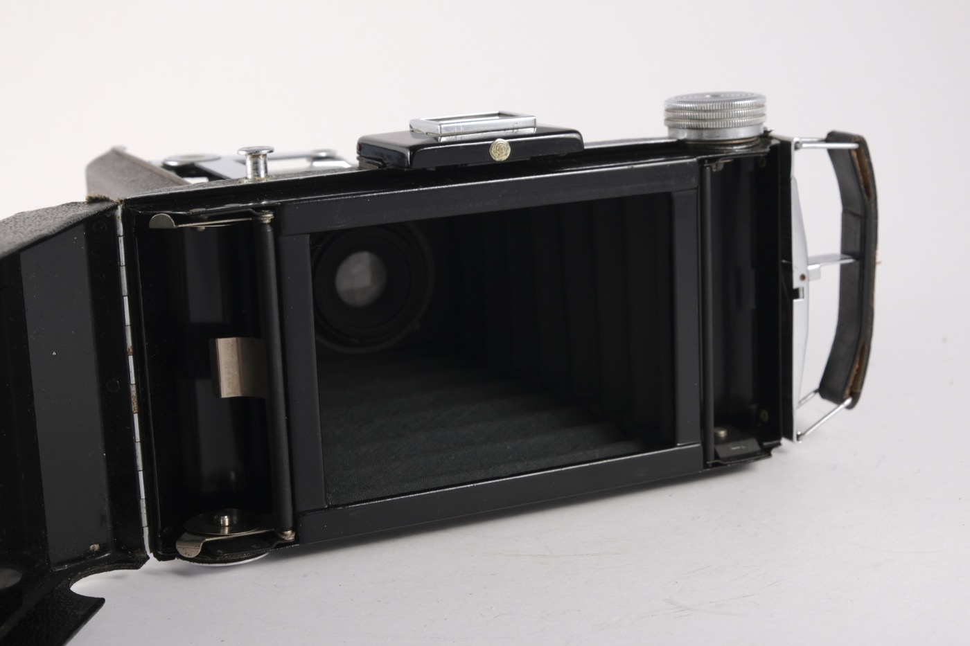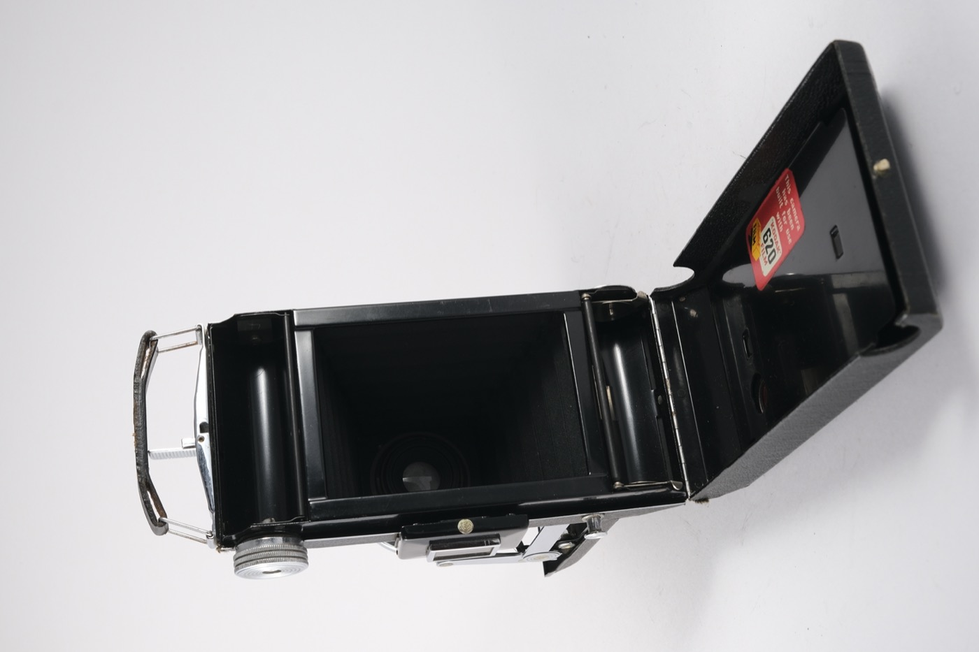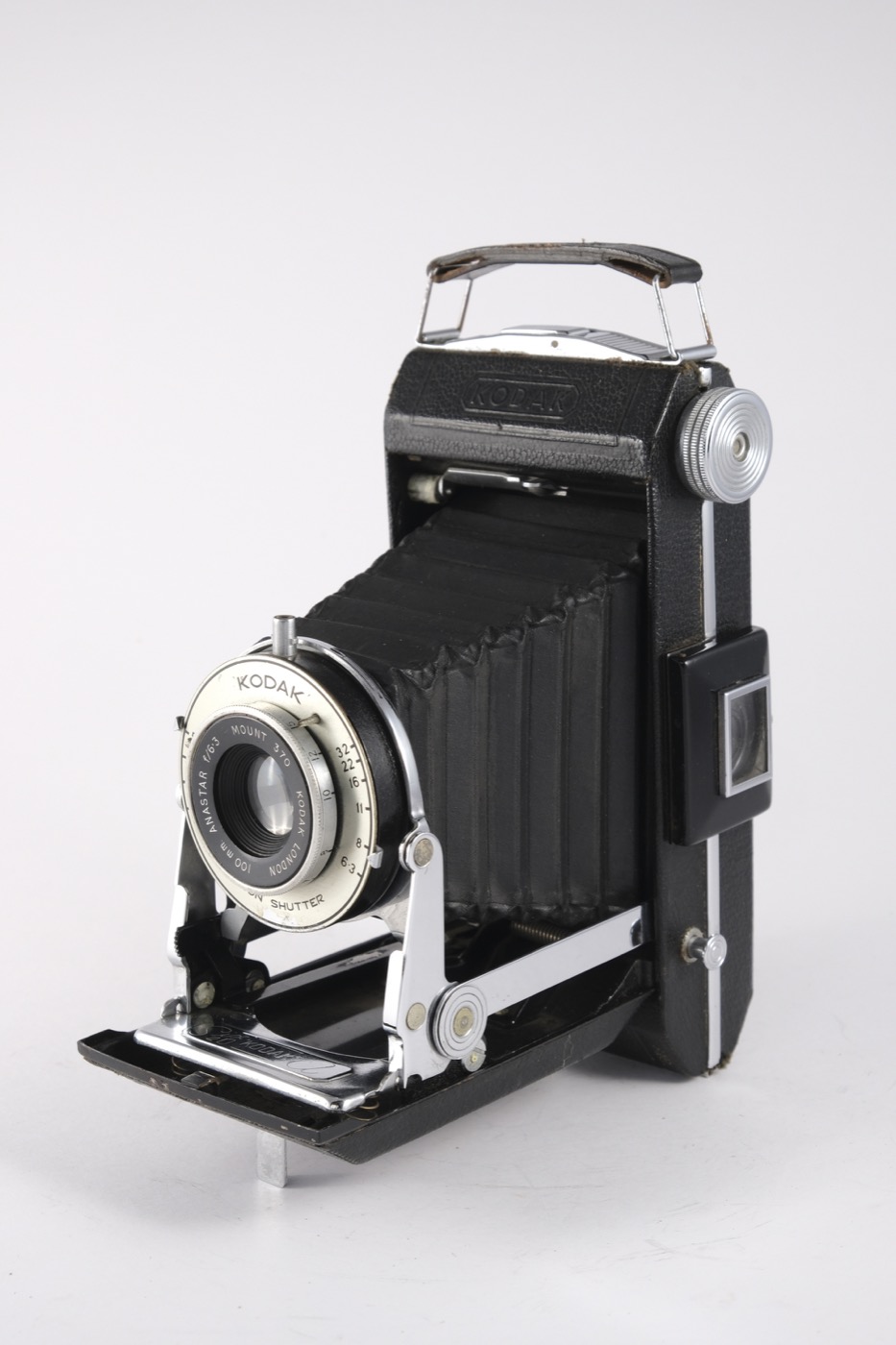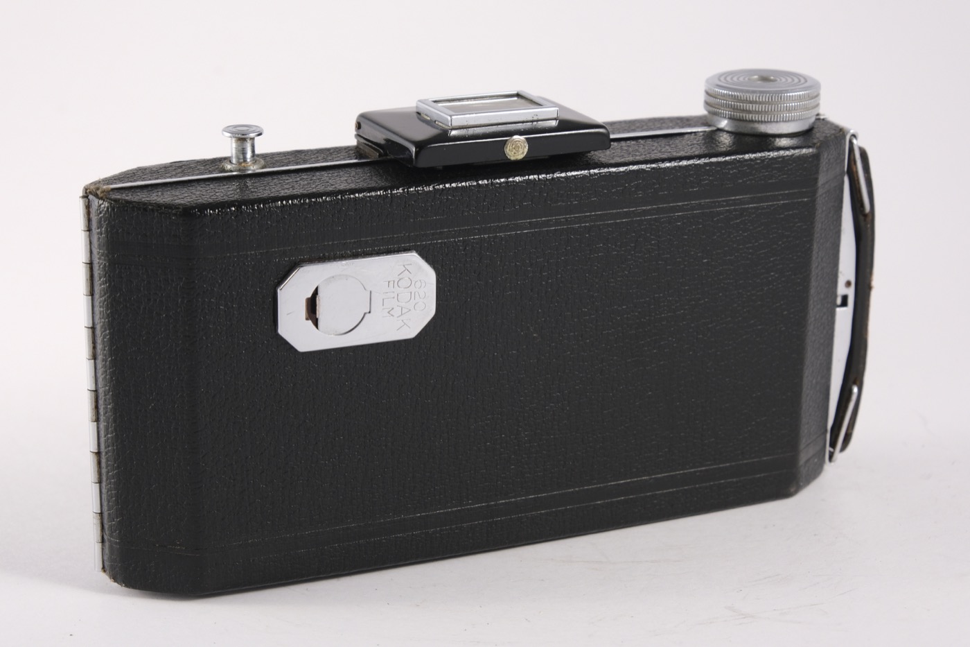 This is a handsome looking box-type camera from the late 1940s. The use of black and chrome on the front plate gives it an expensive look. The body is …