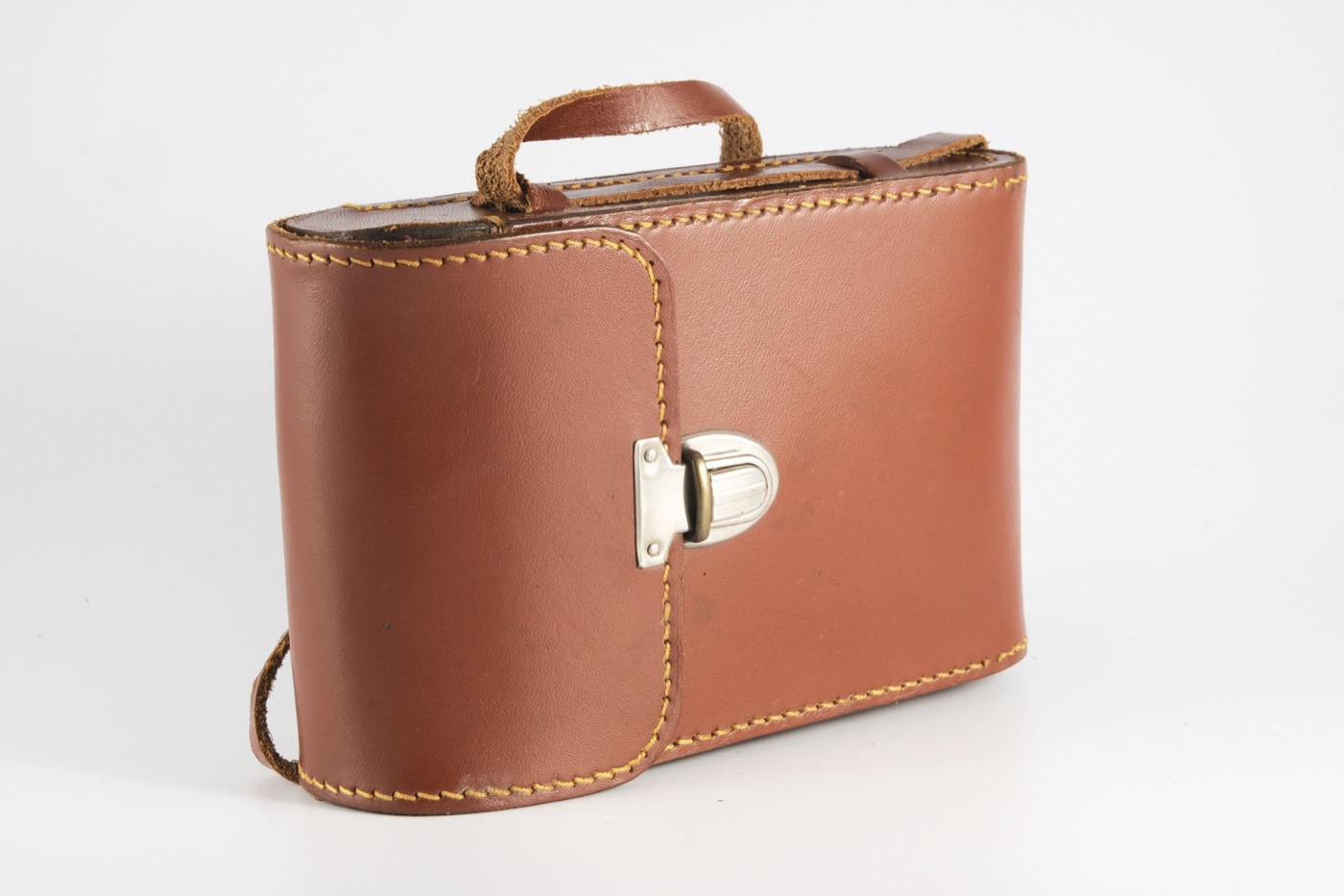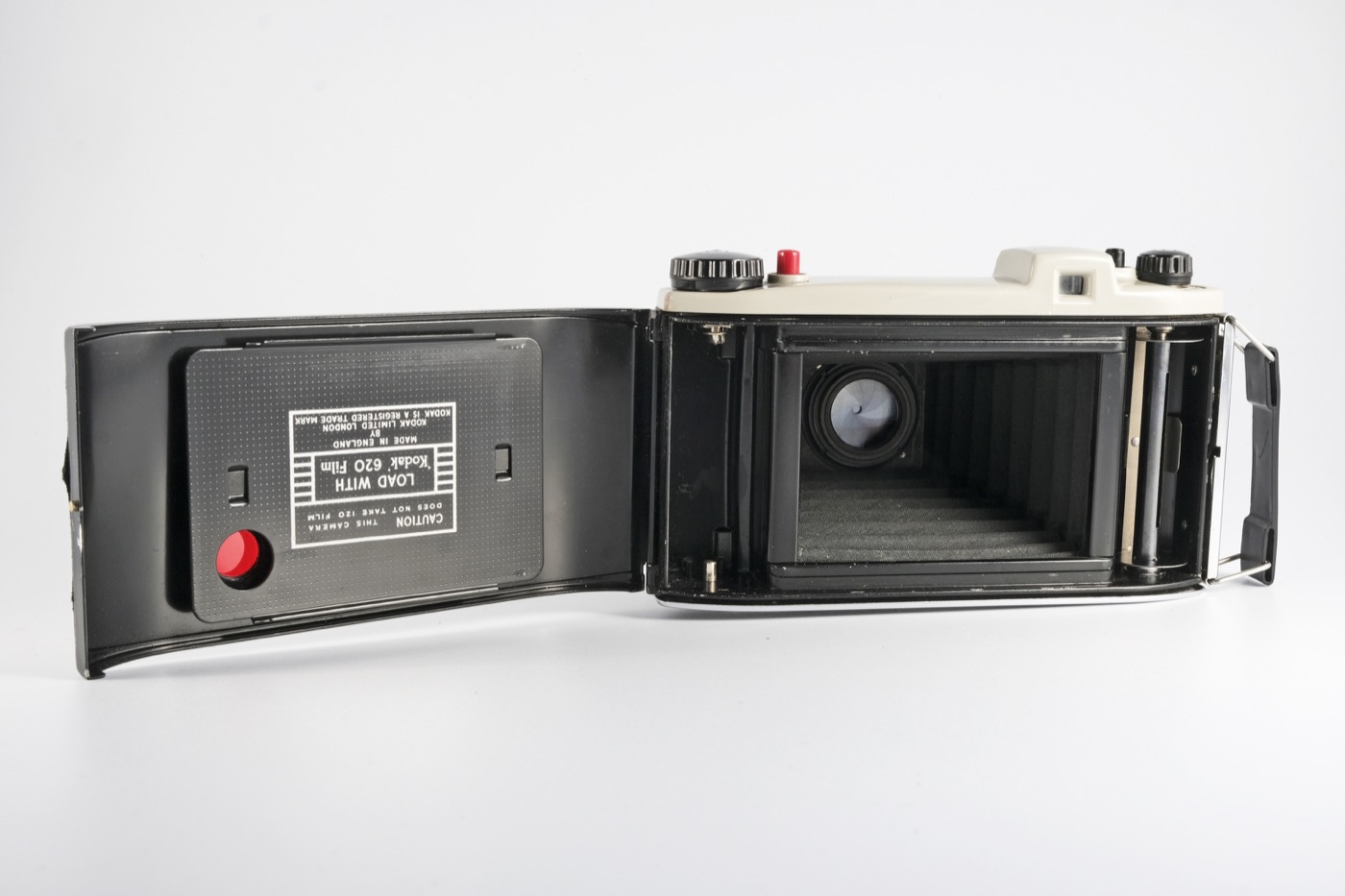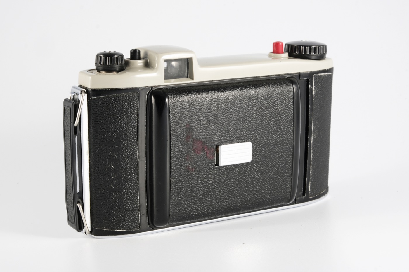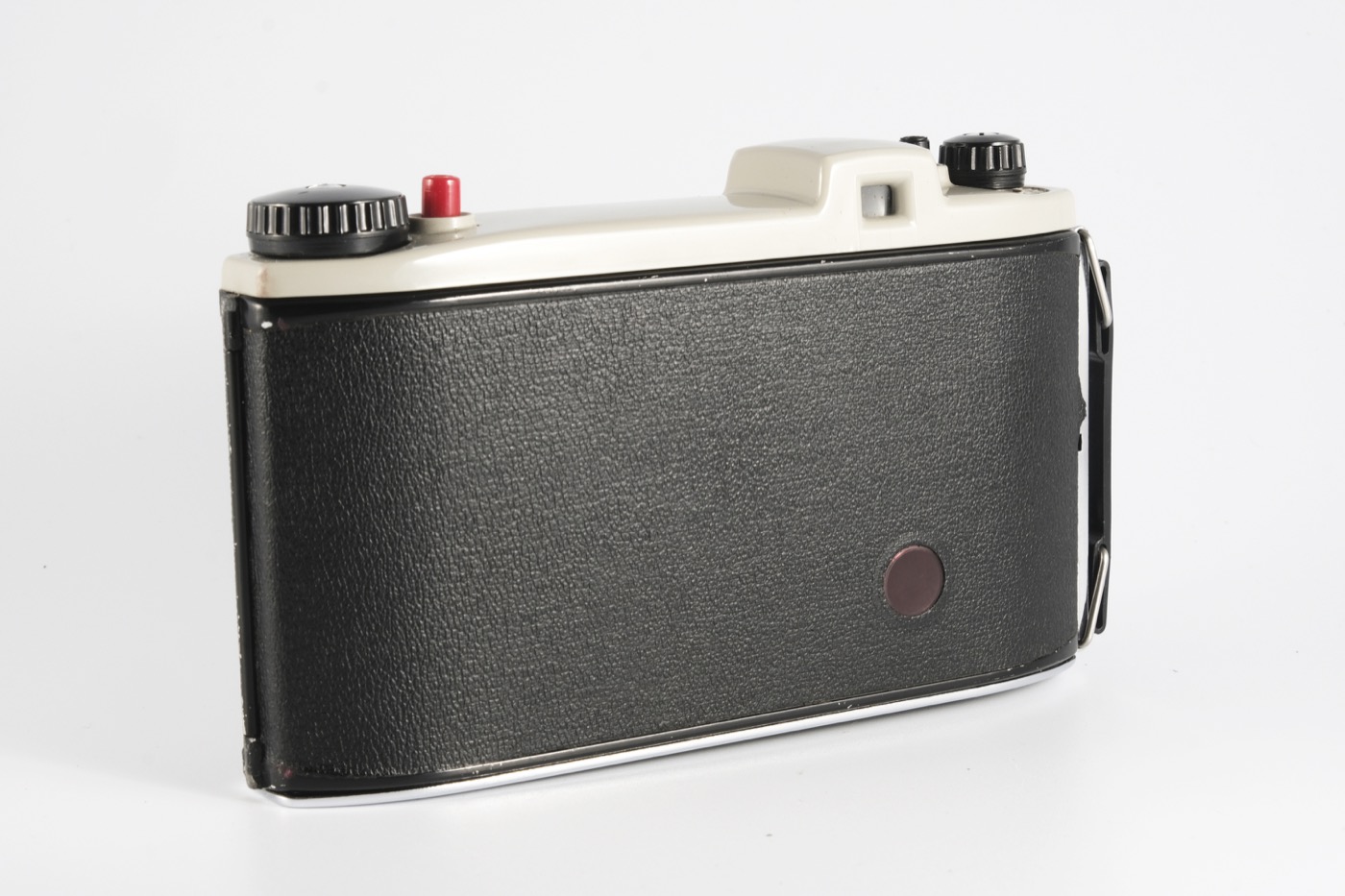 The body is a metal casting with added sheet metal and chromed parts, and a plastic top plate. The button beside the viewfinder is the folding release catch; the red button beside the winding knob is the shutter release. This is an early version with a small plastic knob beside the viewfinder that lifts the feed spool retainer during loading. Later models has larger metal knobs.