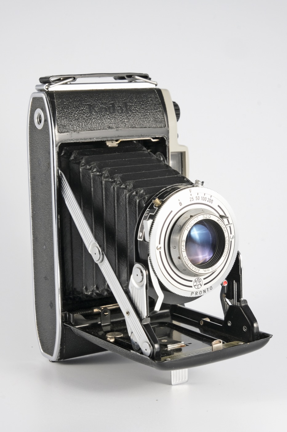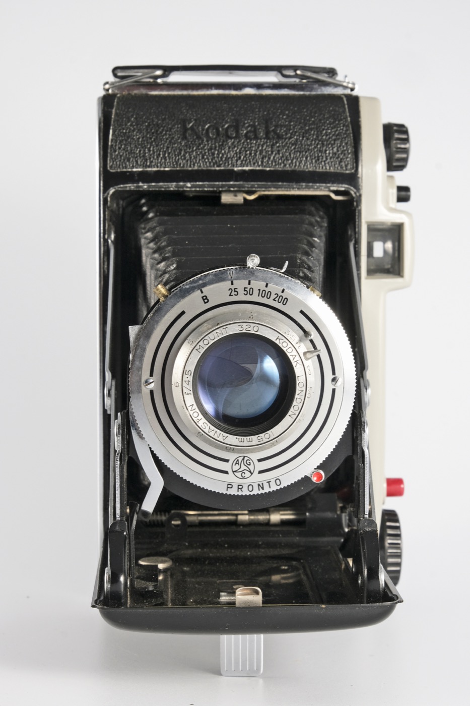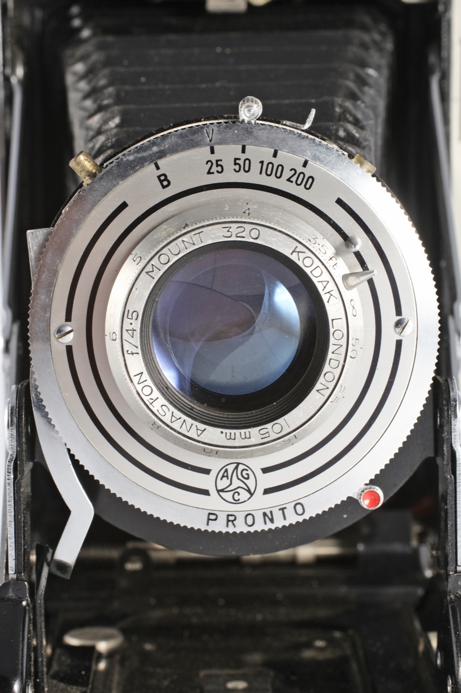 The camera has a Pronto shutter, speeds 1/25-1/200 + B with flash sync and self-timer. The Lens is a Kodak Anaston, 105mm f/4.5, which focuses down to 3.5ft.