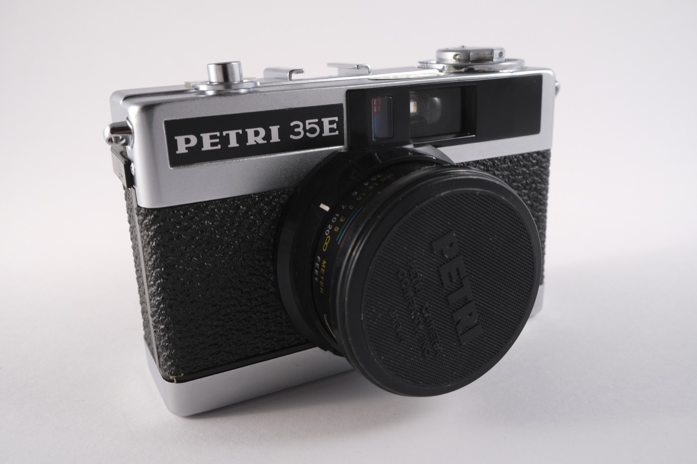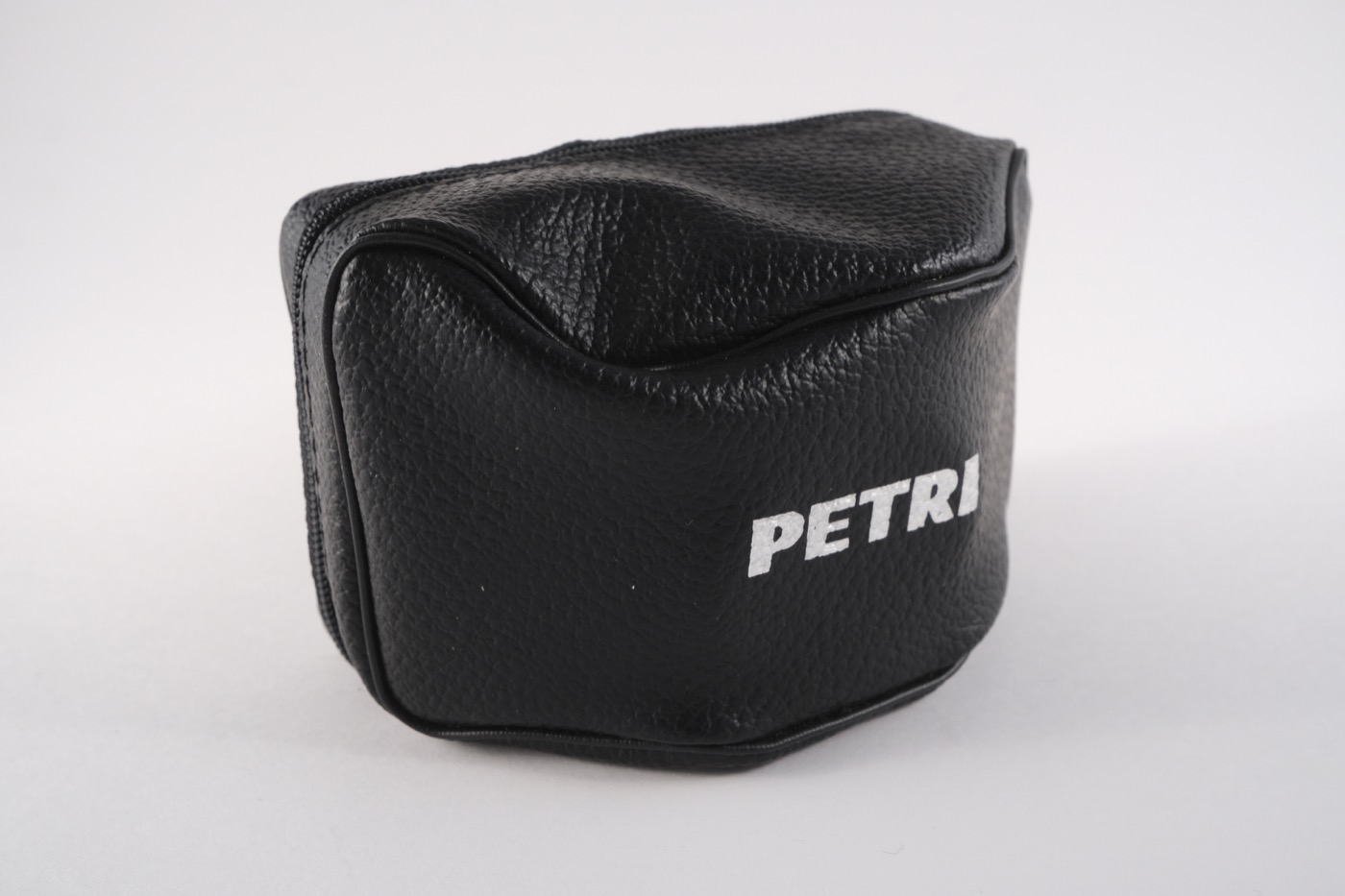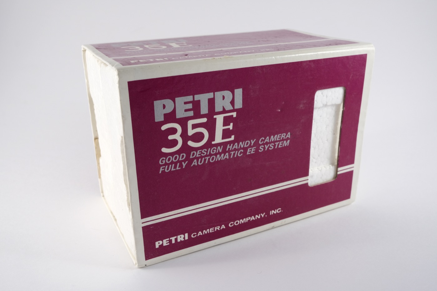 Petri 35E 35mm film camera, in its original box. The camera has a 40mm f/2.8 lens. Original lens cap and soft case.