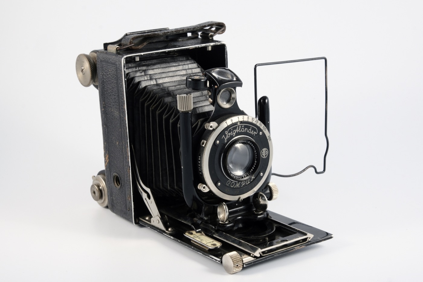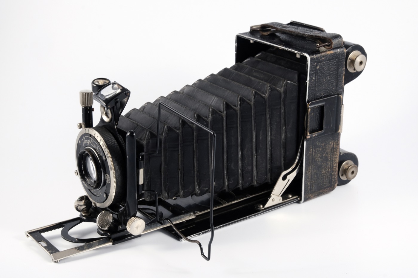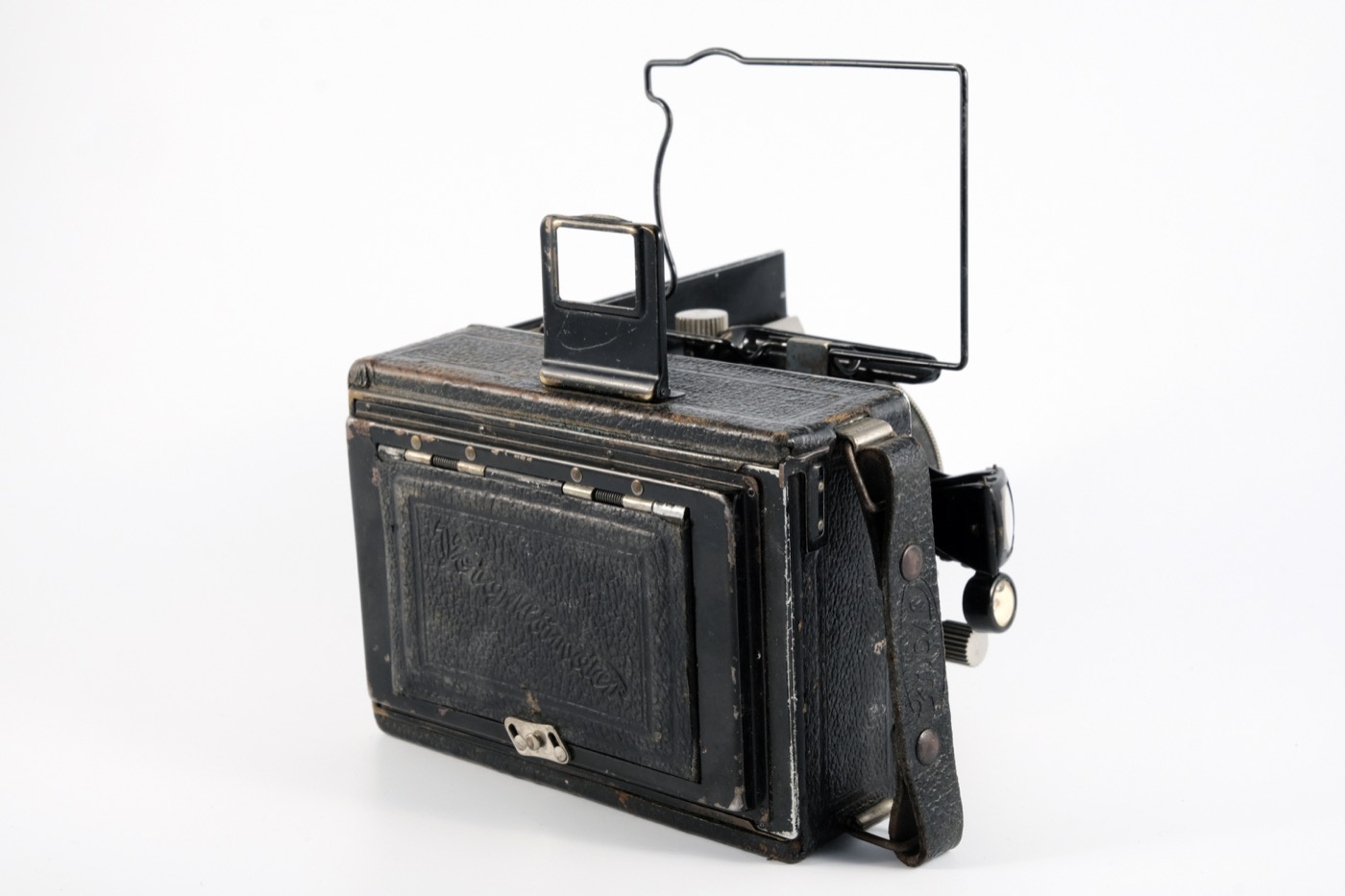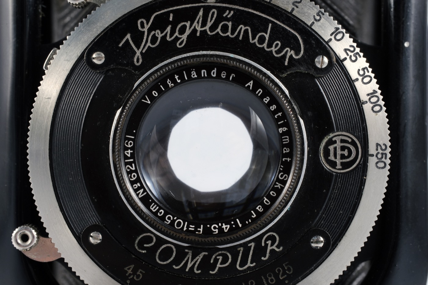 This version takes 6.5 x 9 cm images and is equipped with a roll film back. The lens is a 105mm f/4.5 Skopar anastigmat set in a Compur shutter.